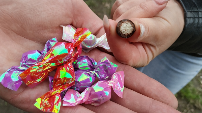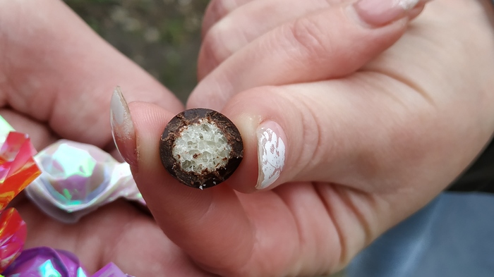 Так было и на этот раз. Купила какие-то маленькие конфетки в очень красивой упаковке, ничего о них не спросив по своему обыкновению. Упаковку стоит отметить отдельно: красивые перламутровые "фантики", переливающиеся на солнце всеми цветами радуги. Никакой информации на них нет ни о производителе, ни о составе. Цена 500р за килограмм. А что же внутри? Кукурузный шарик в кондитерской глазури (шоколадом это не назовешь).