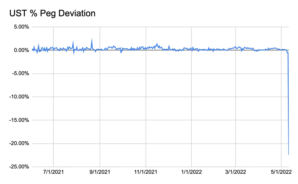 Это график процентного отклонения UST по сравнению с привязкой к $1. Как и в случае с MakerDAO, 0% означает, что привязка надежна.