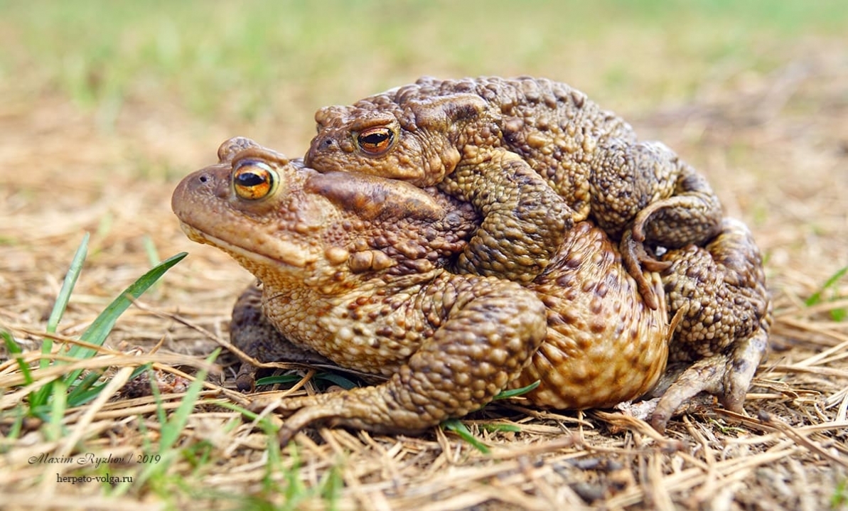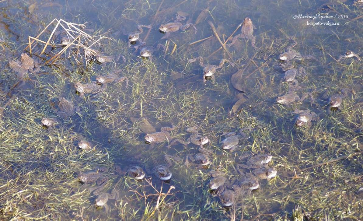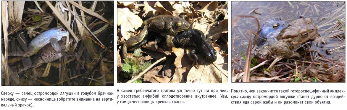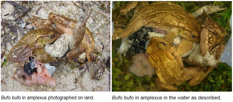 Теперь давайте посмотрим, как это все происходит на примере серой жабы (Bufo bufo). Самцы, приходят на водоем раньше самок. Так как, самке некуда торопиться — к своему нересту она всегда успеет. А вот самец может опоздать и остаться без самки. Хотя, самцу может повезти и он встретит самку еще на суше и он возьмет ее в амплексу и самке придется тащить его на себе. Поэтому, кто быстрее найдет самку то получит преимущество. Из-за конкуренции между самцами получается, что самок на всех не хватает и, поэтому самцы становятся крайне неразборчивы в выборе партнеров. Они готовы наброситься на любой движущийся предмет, по размерам хоть сколько-то напоминающий самку. Ситуация усугубляется тем, что в одном водоеме, практически в одно время может размножаться несколько видов земноводных. Вот поэтому и получаются нестандартные амплексусы с разными видами (гетероспецифичные - по научному)