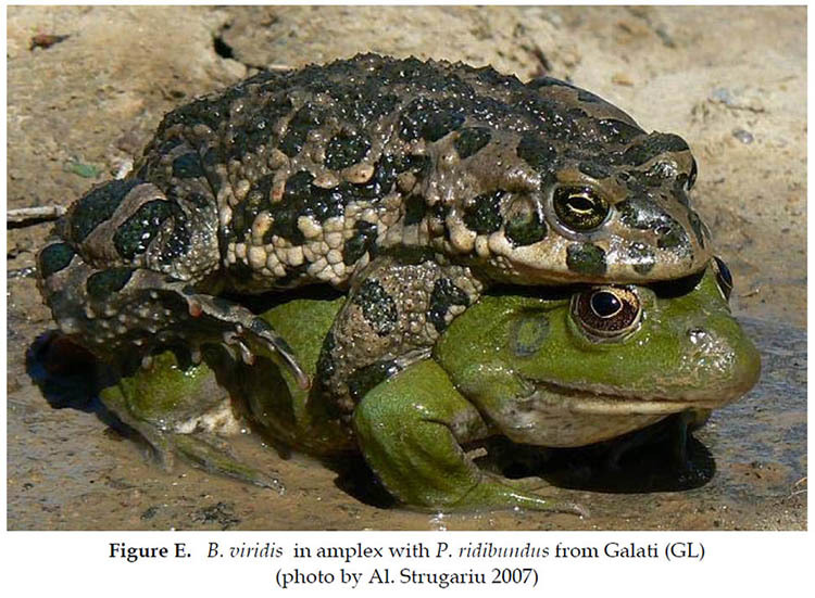 Strugariu A. & Gherghel I (2008) в работе посвященной герпетофауне реки Lower Prut (Румыния) привели фотографию амлексуса зеленой жабы (Bufo viridis) и озерной лягушки (Pelophylax ridibundus). К сожалению, никаких подробностей, относительного этого снимка не было указано.