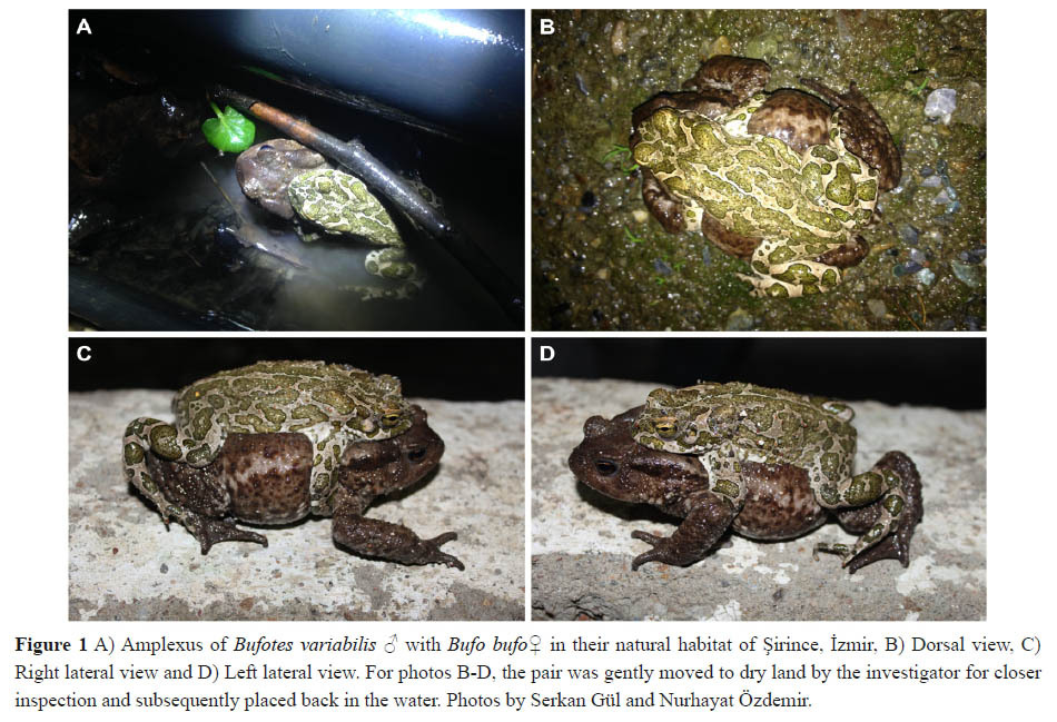 Если уж мы заговорили про Турцию, то создается ощущение, что там самые "горячие" самцы у амфибий. Во всяком случае, в 2018 г. выходит работа (Serkan Gül, Nurhayat Özdemir and Cantekin Dursun, 2018) с описанием нескольких случаев гетероспецифичных аплексусов. Первый случай был замечен между самцом Bufotes variabilis и самкой Bufo bufo 11 марта 2017 года, около 22:30, в искусственном пруду в Шириндже (Şirince), расположенном примерно в 8 км к востоку от города Сельчук, Измир, Турция, высота 359 м (Selçuk, İzmir in Turkey). Причем, других пар в амплексусе в это время не наблюдалось, хотя особи Bufotes variabilis и Bufo bufo в Шириндже были обнаружены в очень маленькой речке, протекающей недалеко от этого участка. В день наблюдения, среднесуточная температура составляла 10,2°C.