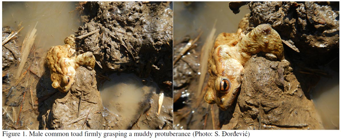Возвращаемся к серым жабам (Bufo bufo). В 2014 у Sonja Đorđević and Aleksandar Simović выходит работа с интересным наблюдением. 11 марта 2014 г., ок. 10:00 авторы мы посетили пруд на горе Авала (230 м над уровнем моря), где было замечено размножение серых жаб. Например, было несколько «брачных комков» – где энергично дрались от 3 до 10 самцов за одну самку. Но, это ладно, обычное явление. Самое интересное, что на берегу пруда был замечен одинокий самец, который вцепился в комок грязи и по словам авторов статьи - он в таком положении завис минимум на полчаса.