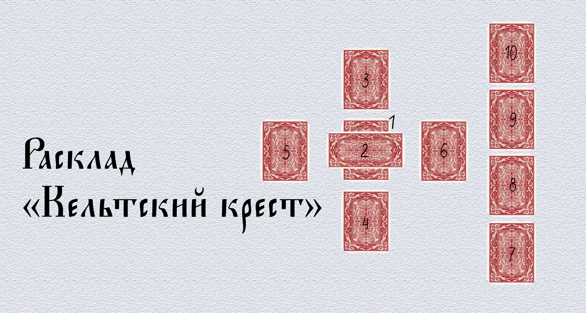 Если вы готовы к более глубокому анализу, попробуйте адаптировать знаменитый «Кельтский Крест» — один из самых популярных раскладов в Таро. Он прекрасно ложится и на систему игральных карт.