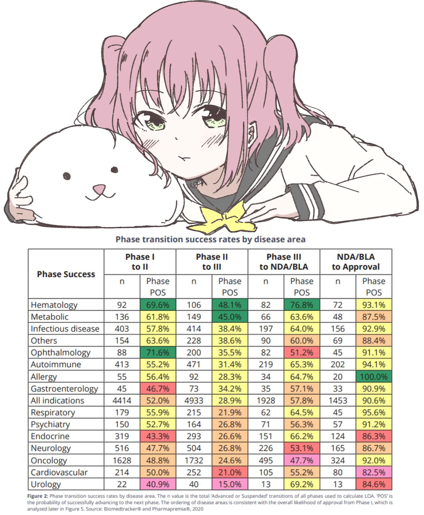 А из дошедших, от 1 фазы до одобрения проваливаются еще 95% препаратов[для антираковых, табличку прикладываю ниже], и если они провалятся на отсутствии эффективности – это еще неплохой результат, так как, например, препараты генной терапии обычно проваливаются на 2 фазе по причине смерти пациентов/развития меланомы, что особенно иронично при лечении «против» рака.