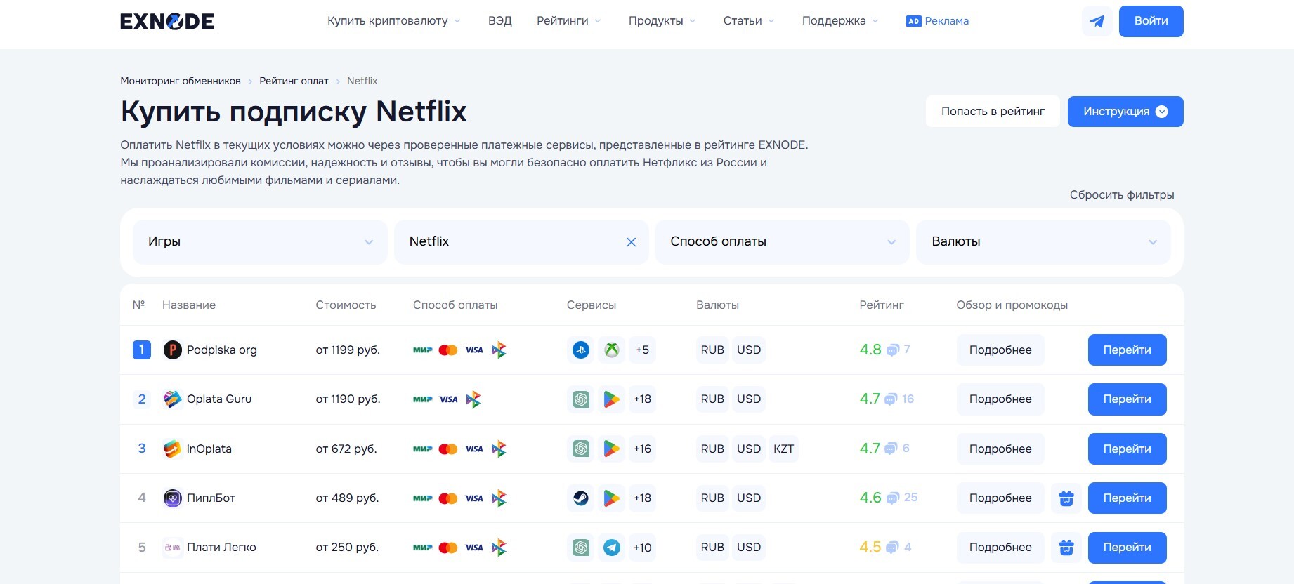Откройте Exnode и найдите рейтинг сервисов для оплаты зарубежных подписок. Там собраны площадки, через которые можно оформить Netflix подписку, сравнить условия, комиссии и способы оплаты. Выберите сервис, который вам подходит, и нажмите «Перейти», чтобы попасть на официальный сайт или в Telegram-чат.
