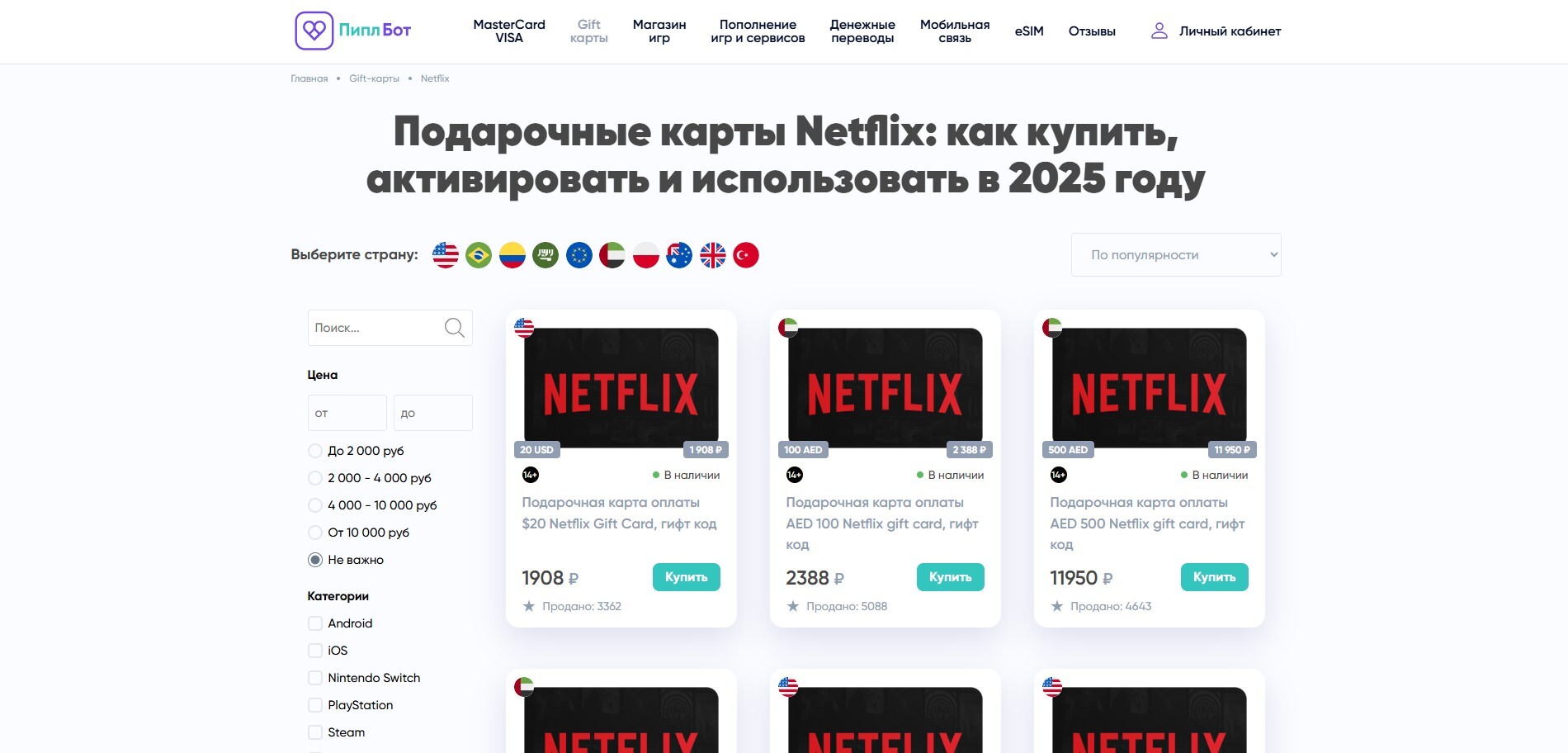 ПиплБот специализируется на продаже подарочных карт Netflix для разных стран, включая Турцию, страны ЕС, США, Австралию и другие регионы. Пользователь получает цифровой код и активирует его самостоятельно на официальном сайте Netflix в разделе Redeem, после чего средства зачисляются на баланс аккаунта.