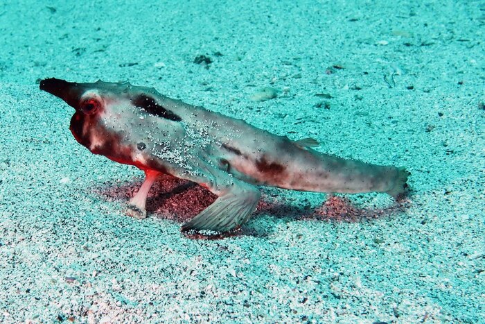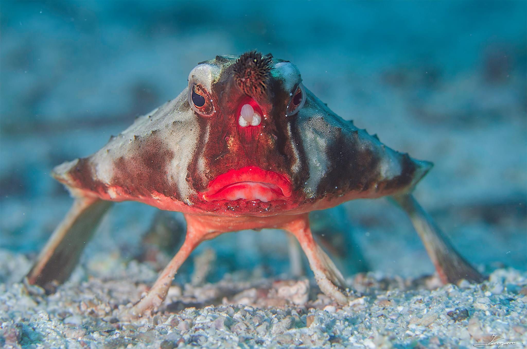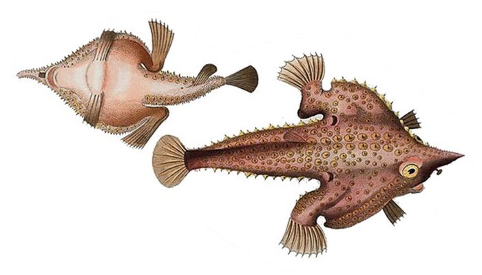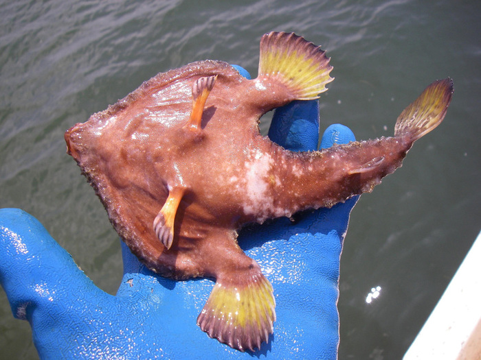 Нетопырь Дарвина (лат. Ogcocephalus darwini) – это рыбка настоящий черт, вернее из отряда морских чертей (удильщикообразных) из семейства нетопыревых, вид лучеперых рыб. Свое название рыбка получила в честь Чарльза Дарвина, который изучал живность на Галапагосских островах, где нетопырь и обитает. Они еще встречаются у берегов Перу и в окрестностях Эквадора. Короче говоря, рыбка теплолюбивая и у себя на речке вы такое точно не найдете.