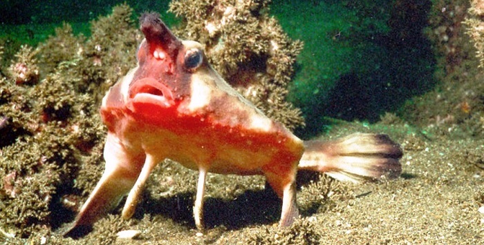 В процессе питания нетопыри добывают себе пищу, выкапывая ее из грунта при помощи рта и рострума (это такой нарост на голове типа носа или клюва). У нетопыря Дарвина этот нарост особенно крупный, прямо как рог, и смотрится со стороны довольно комично, особенно в сочетании с остальными чертами внешности рыбки: все эти маленькие ножки-плавники, красные губы, как у клоуна. Однако, если вспомнить, что у природы не бывает ничего ненужного, и все эти комичные черты внешности были приобретены в процессе долгого эволюционного развития, тогда сразу перестаешь угарать с этой рыбы (ну или не перестаешь, ведь она и правда забавно выглядит).