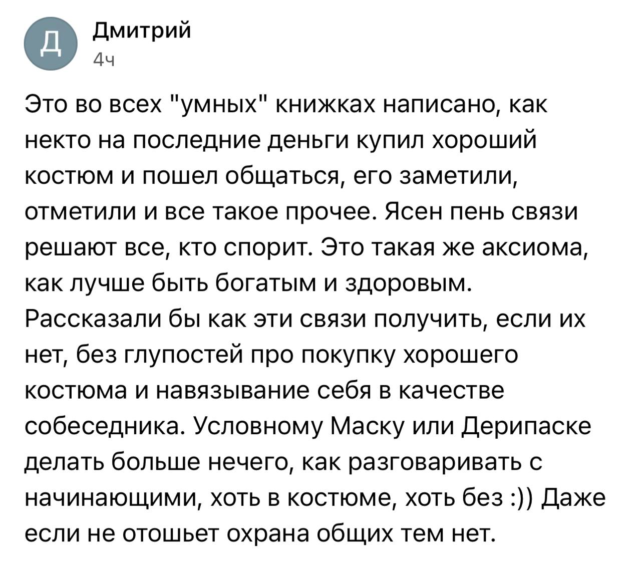 Не нужно торопиться установить связи с условным Маском или Дерипаской. Начните общаться с теми, кто не одном уровне с вами по рангу/статусу и теми, кто на один уровень выше. Станьте полезными для них. Потом они помогут вам пойти на следующие ступеньки. Через несколько лет сможете и до условного Маска добраться. Построение сети связей - всегда длительный процесс, это минимум годы. А то и десятилетия.