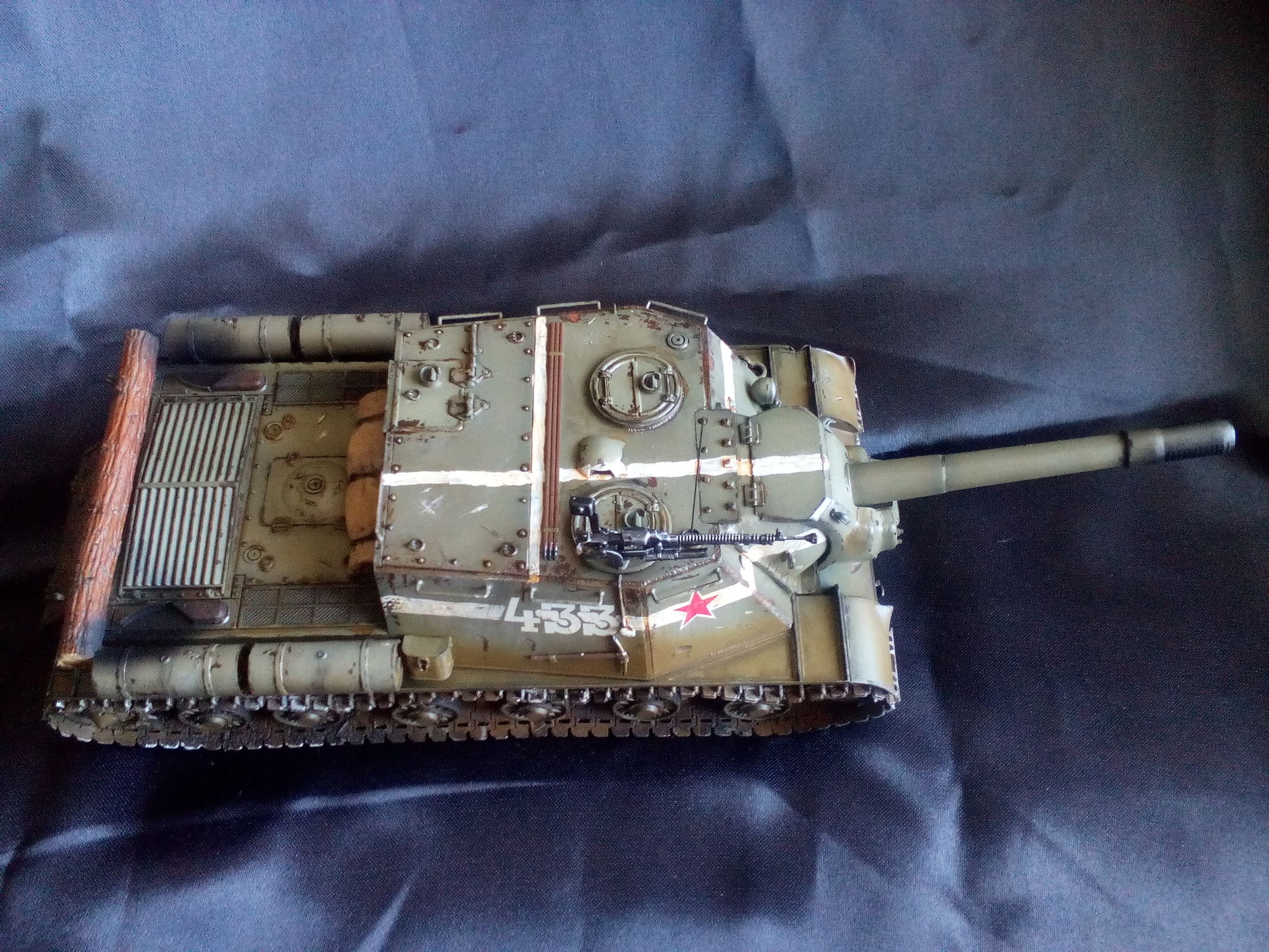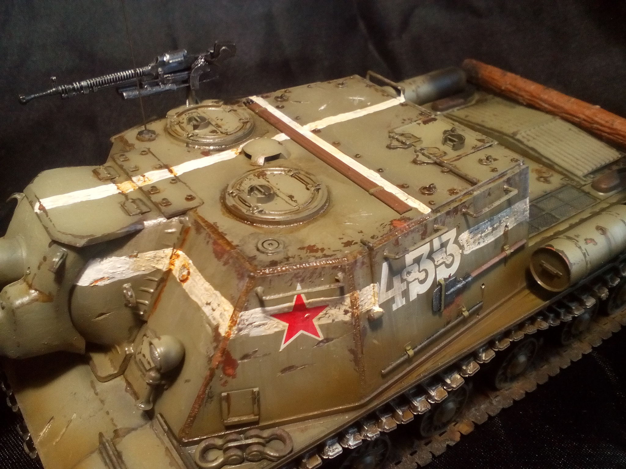 Нанесены декали, их подобрать идеально не удалось. У машины, которую я делал на пушке была надпись "Бей фашистов!" более крупным шрифтом, а звёзды наоборот были мельче и явно нарисованы от руки, номер правда очень похож. Далее окрашены и приклеены отдельные элементы типа запасных траков, пулемёта, шанцевого инструмента. Все "металлические" детали траков, пулемёта, инструмента обработаны сухой кистью светлым металликом. Сильно разведёнными водой красками окрашена скатка.