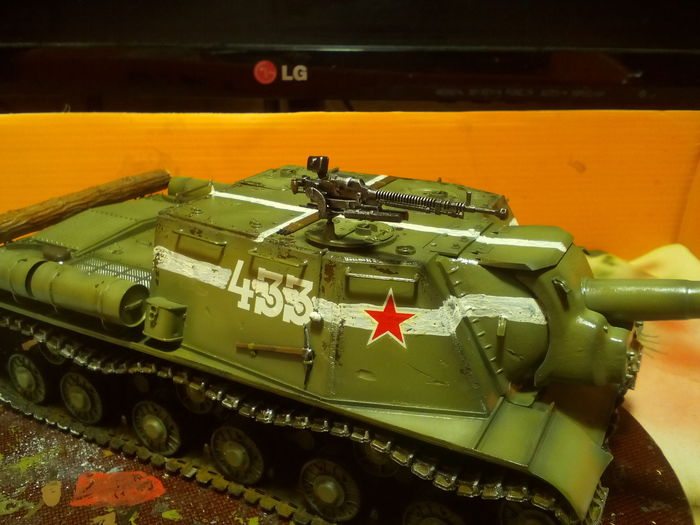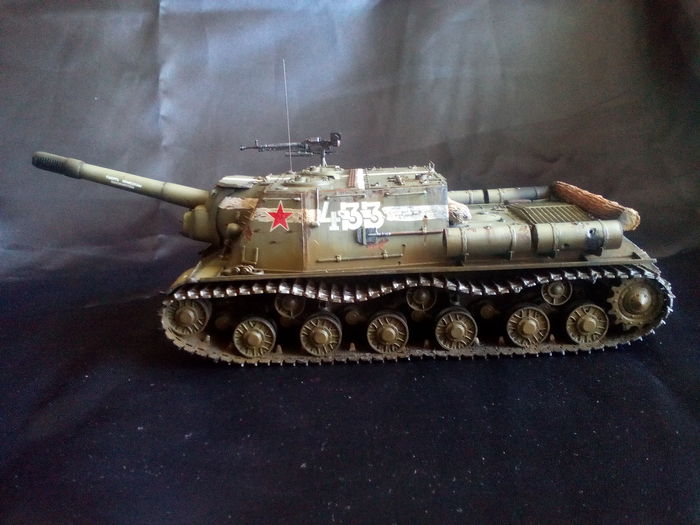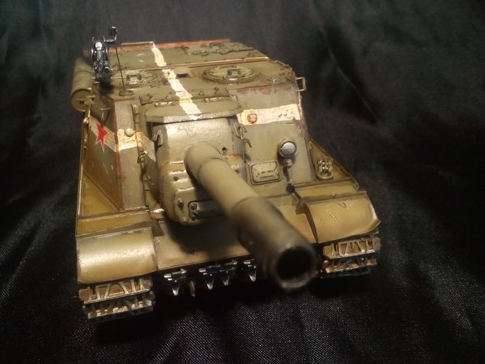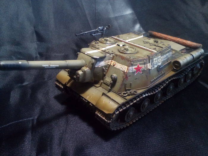 Представлена ИСУ-152 из 53-го ОТСАП (отдельного тяжёлого самоходно-артиллерийского полка), штурм Кённигсберга, апрель 1945 года. Белая полоса вдоль рубки и крест на крыше - временное явление, характерное для апреля 1945, наносились для идентификации советских танков союзниками. В дальнейшем от такой маркировки отказались, потому что немцы быстро научились рисовать такие же полосы на своей технике.