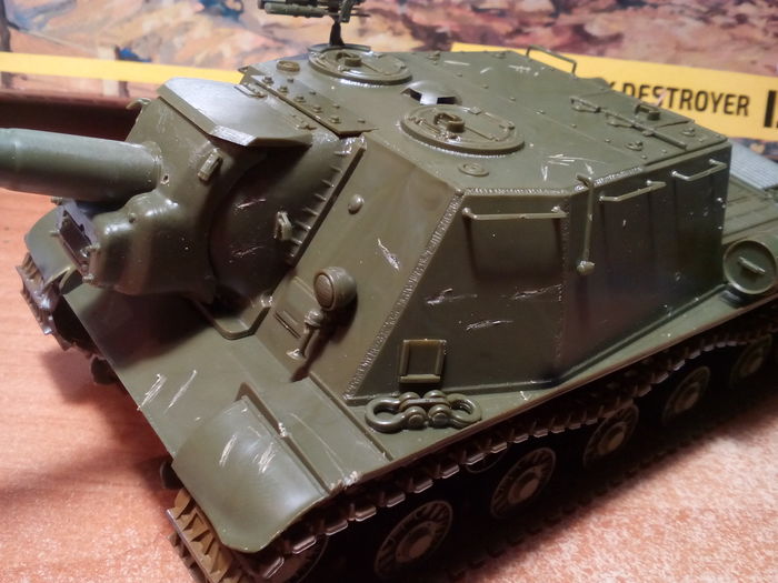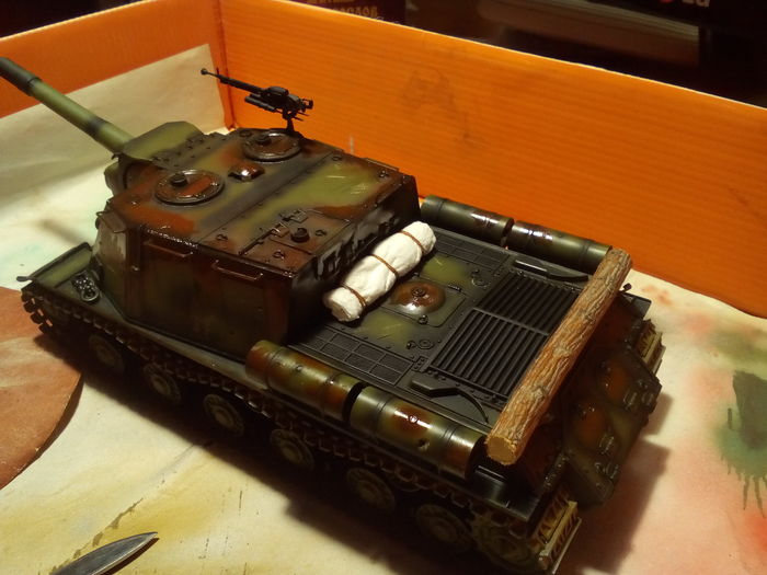 О создании: собирал самоходку на сверхтекучий клей Tamiya и обычный от "Звезды", гусеницы клеил и придавал им провис при помощи цианоакрилата, им же приклеена и антенна из отрезка струны. По ходу сборки на корпусе сделаны следы от попаданий и рикошетов снарядов разных калибров, также сымитированы царапины и погнутость крыльев.