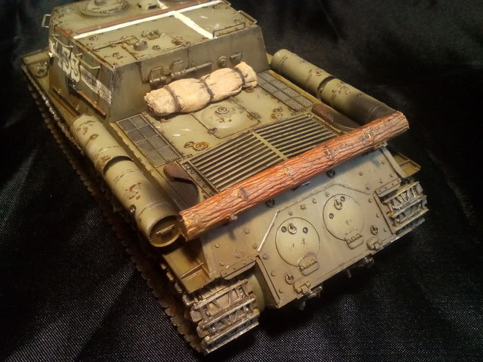 В завершении сделана коричневая и чёрная смывка, белой смывкой выделены царапины и сделан эффект потёков от осадков. Вытекшее горючее из пробитого дополнительного бака и вообще потёки ГСМ и грязи сделаны смесью смывок. Выхлопные трубы и сильно заржавевшие участки покрашены Vallejo Rust Texture. Металликами и смывками выделены следы попаданий. Надут нагар на стволе орудия, закопчение от выхлопа и запылённость на корпусе и ходовой. Финиш - матовый лак Mr.Hobby.