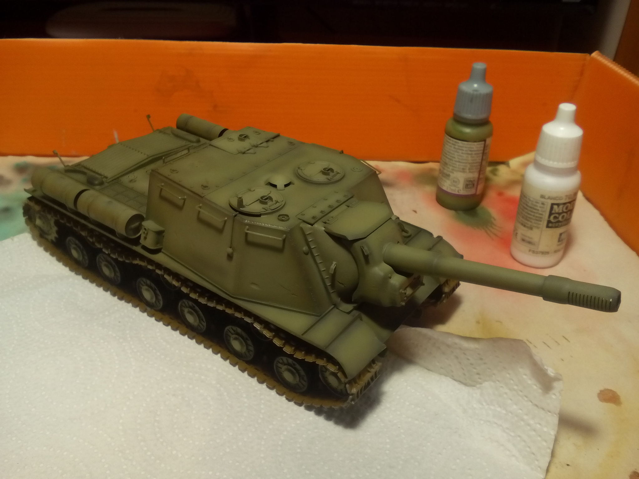 Самоходка окрашена в серо-зелёный (по-моему, довольно близко к советскому "Защитному"), сделаны высветления посредством добавления в краску белого цвета.