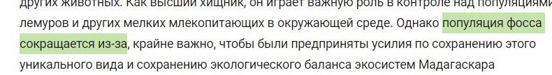 В заключение отметим, что фосса — очаровательный хищник, обитающий на Мадагаскаре. Имеющий уникальный внешний вид и не стандартные модели поведения, отличающие его от других животных. Как высший хищник, он играет важную роль в контроле над популяциями лемуров и других мелких млекопитающих в окружающей среде. Однако популяция фосса сокращается, крайне важно, чтобы были предприняты усилия по сохранению этого уникального вида и сохранению экологического баланса экосистем Мадагаскара.