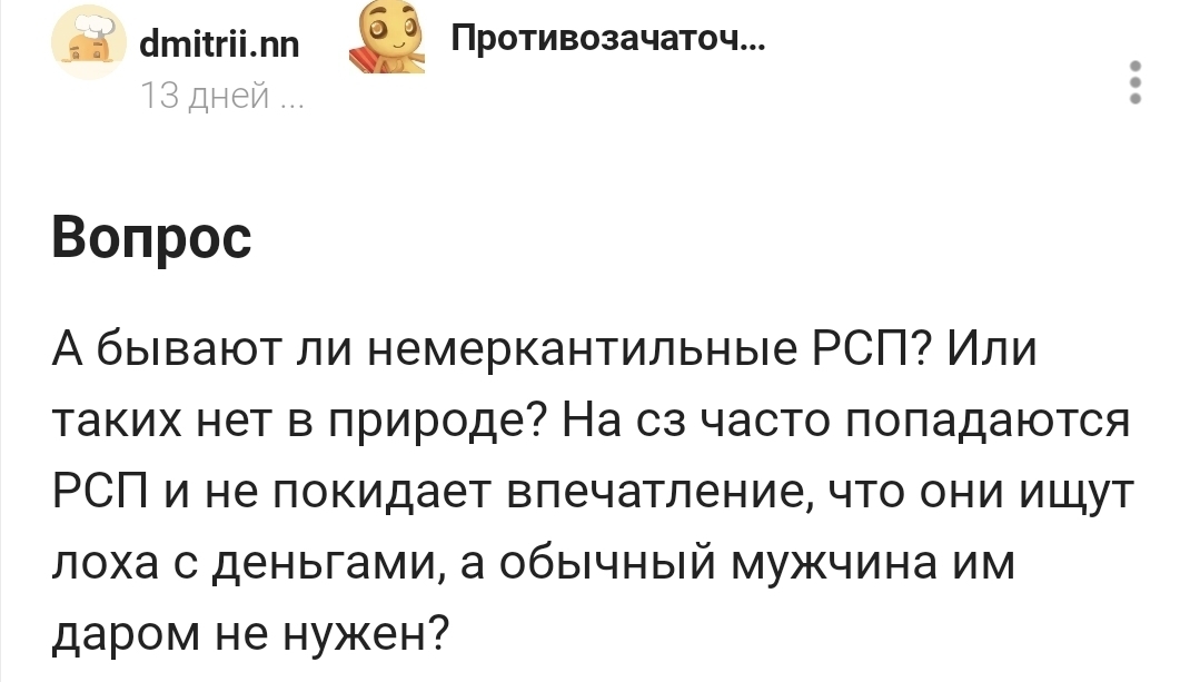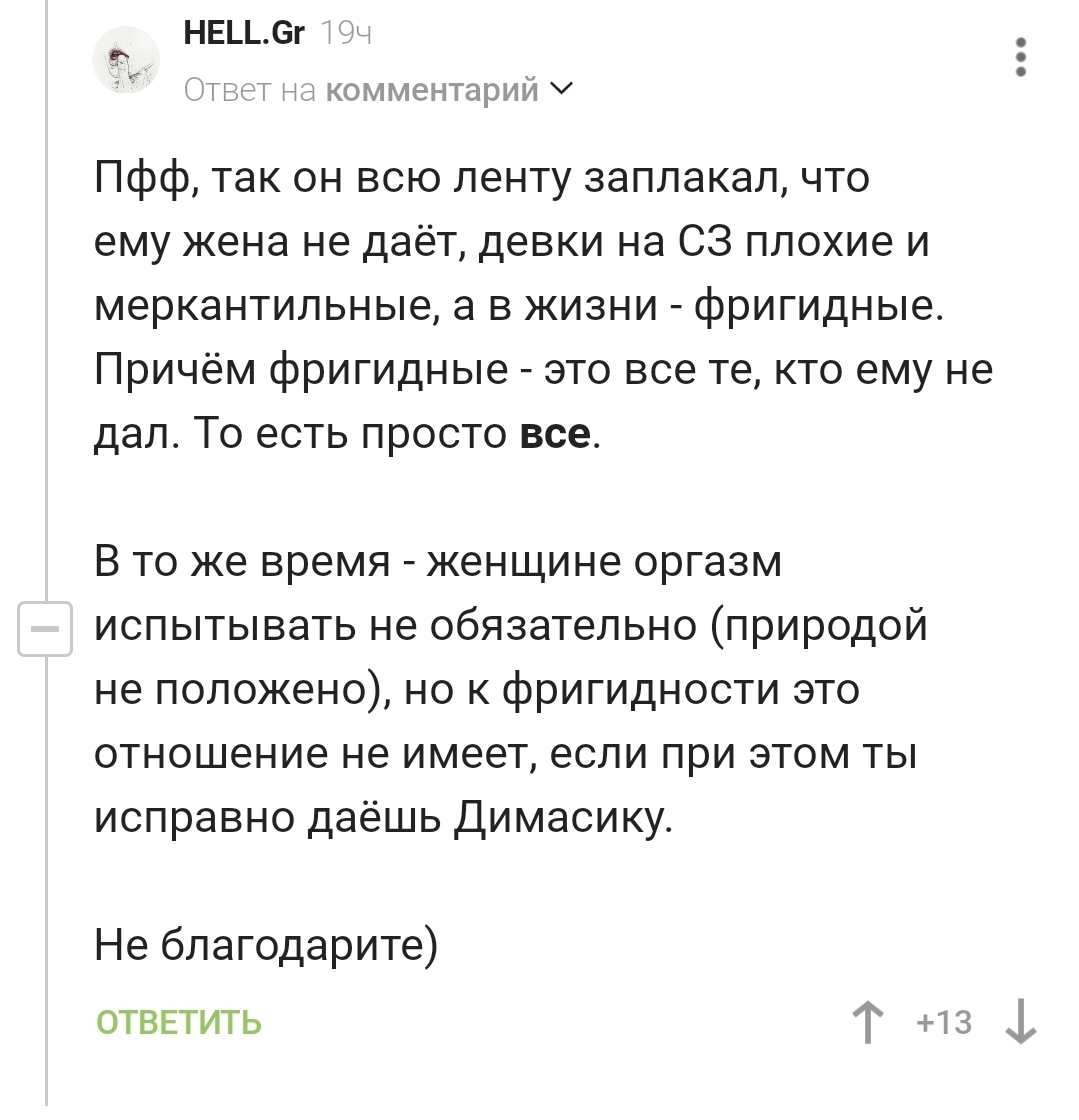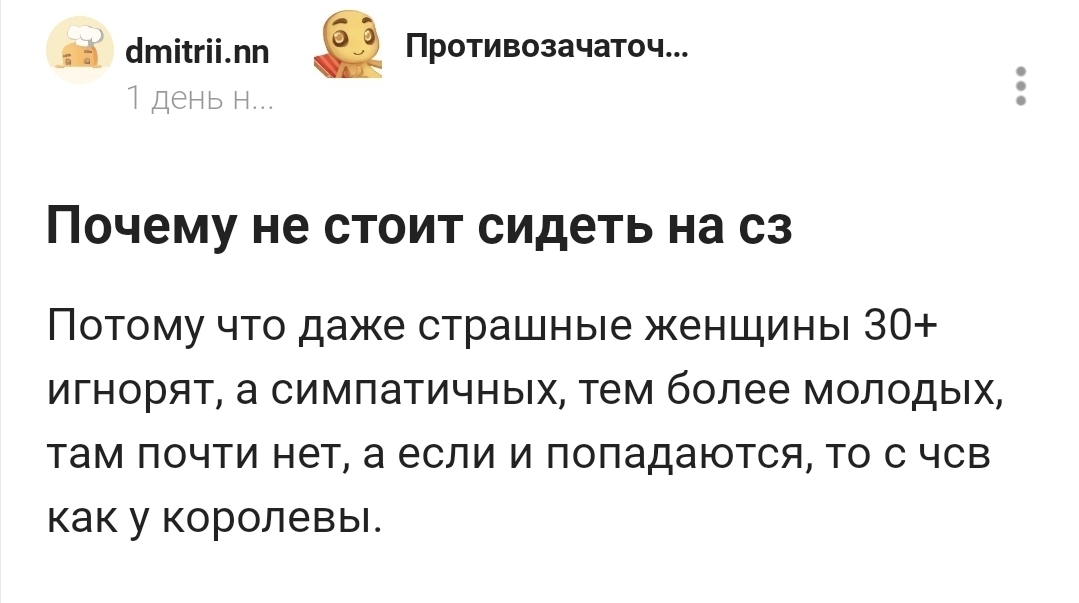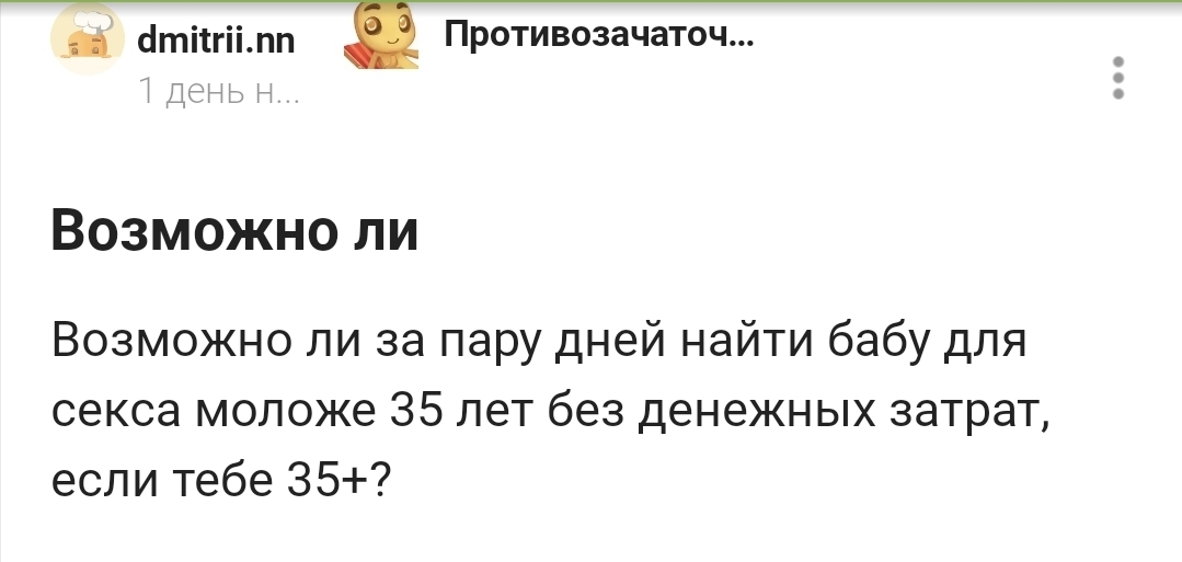 467 dmitrii.nn Противозачаточные шутки Юмор Неуместные вопросы1 8 месяцев назад Почему у мужчин про зарплату можно спрашивать, а у женщин про умение делать глубокий минет нельзя? [моё] Женщины Мужчины Разговор Юмор Зарплата Жизнь Мудрость Жизньболь Короткопост Текст 61 23 12 2 1 Ещё 0