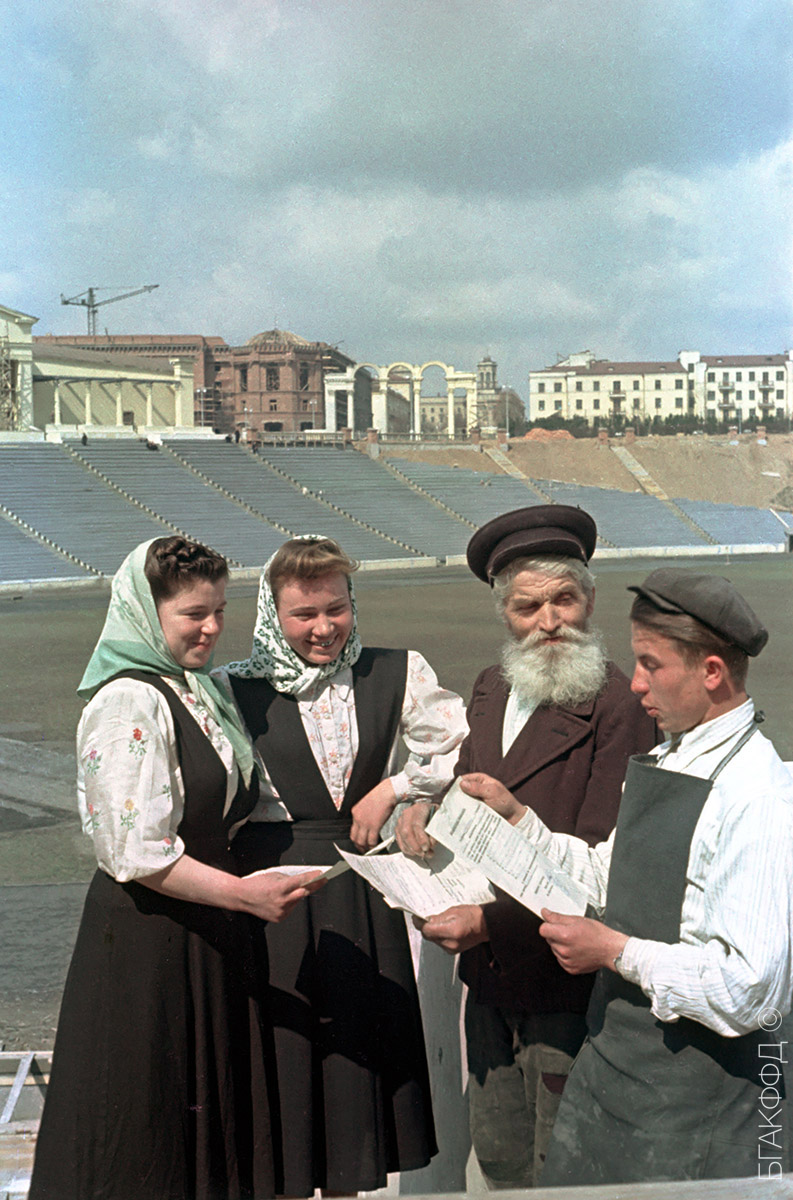 Строители во время работ на стадионе «Динамо». 1954 год.