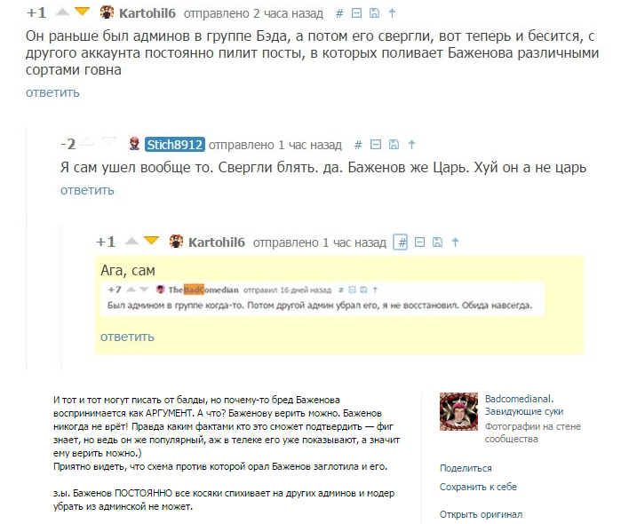 Я работаю админом обзорщика Сокола. Объясните мне пожалуйста, почему когда я выкладывал его ролики - в комментах его начинают оскорблять? Когда я делаю посты тут и выкладываю в группу - мне пишут - там аудитория быдло. Ноя всегда защищал аудиторию сайта. Но боже ш мой. Стоило выложить обзор, как прибегали люди и начинали лить дерьмо, оскорбления. Ну не нравится - поставьте минус. Они разве не для этого нужны? Вы не понимаете что так вы только себя оскорбляете? При этом никаких доводов никто не привел ни разу. Один убеждал что он своровал обзор у Критика, а оказалось что у Критика вышел он позже. И куда то этот чувак резко пропал. Только оскорбления. Да может его юмор кому - то не нравится. Ну так объясните недостатки. Вам самим нравится такая аудитория? Многие знают что я не фанат Баженова. Но у меня всегда есть доводы. Я могу отстоять сове мнение об это блоггере. Мне жаль что материалы для сайта отбирает такая аудитория. Невоспитанная, грубая и жалкая. По вашему полный человек не может быть смешным. Вы забыли видимо кто такой Евгений Моргунов. Почему то я не слышал как его называли "жиробасом", "жирным мудаком". Да есть много полных людей, которые подарили кучу положительных эмоций. Вот только он воспитанный и ответственный человек. А вы только и можете поливать дерьмом в комментах.
