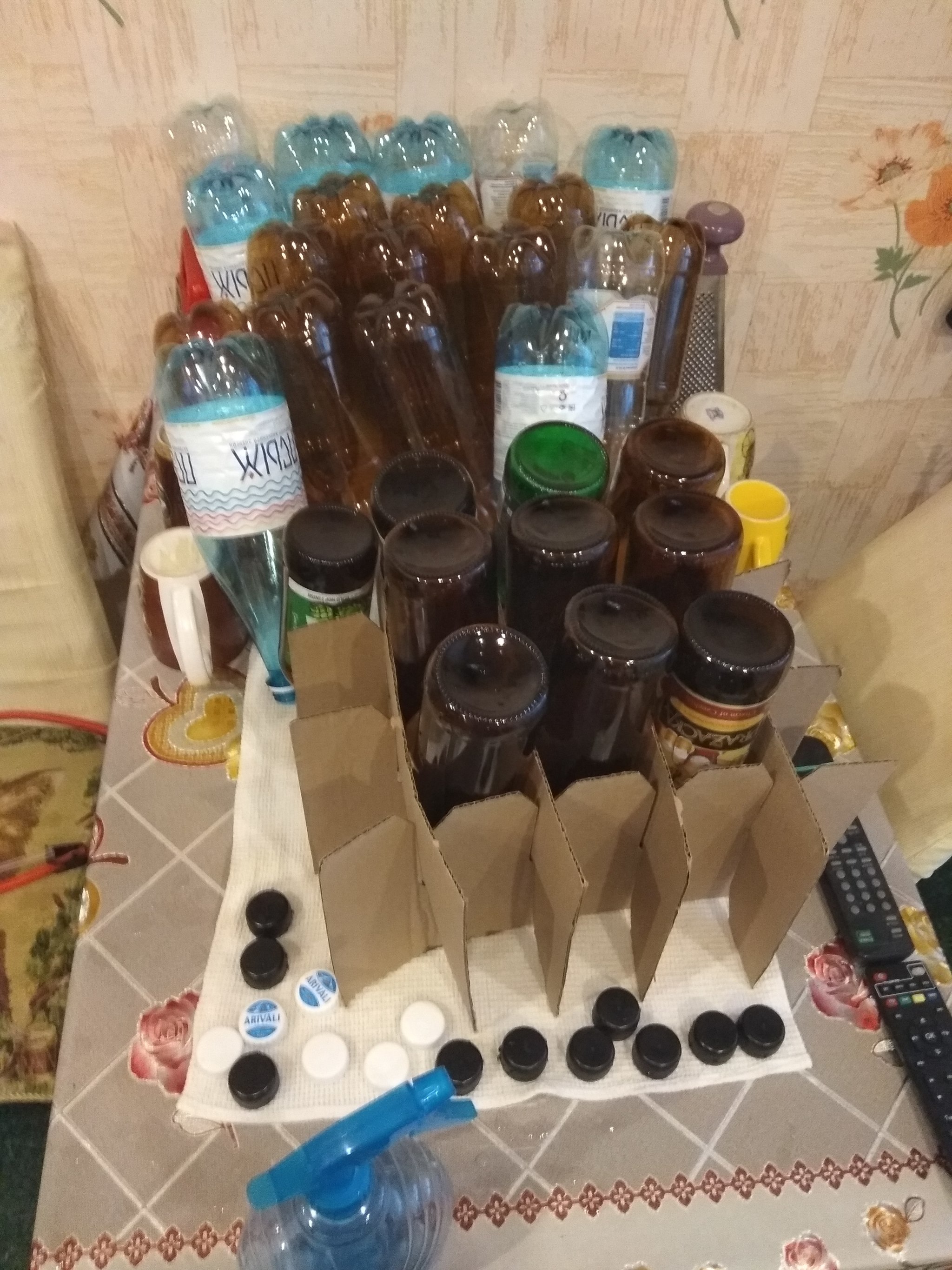 Далее как обычно - подготавливаю тару (да да, я из тех кто заливает в бутылки из под минералки, может не эстетично, но в целом для домашнего распития подходит). Я споласкиваю бутылки и в каждую брызгаю спиртовой раствор. На фото много тары, по факту вышло меньше - 19,5 литров. В каждую засыпаю декстрозу (до принудительной карбонизации пока еще не дорос) с помощью мерной ложки, но правда засыпаю в 1,5 раз больше, т.е. на ложке указано 0,75 л - таких идет 2 в литровую бутылку. Не знаю почему, но так делаю давно.