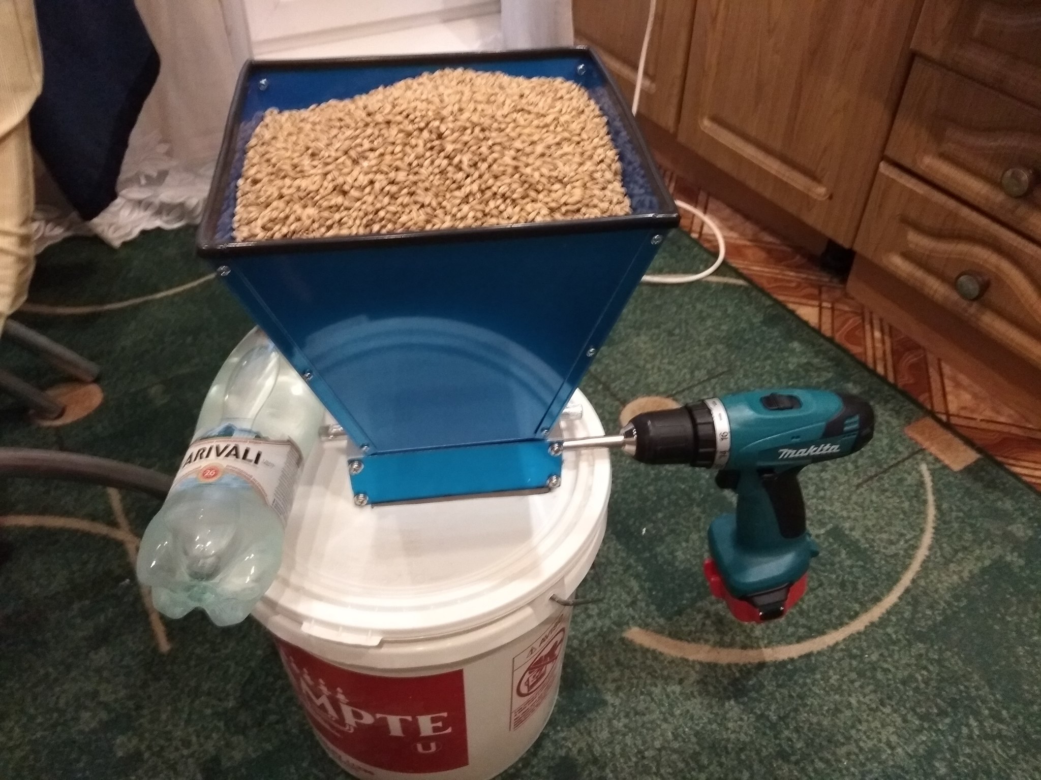 Перемалываем солод. Старенький шуруповерт нам в помощь.