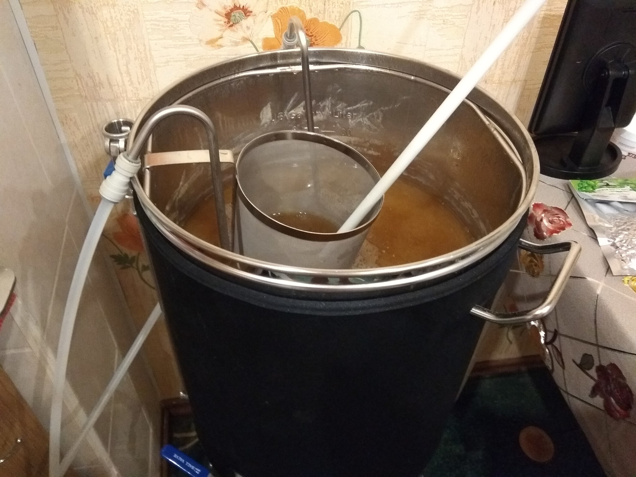 И так за 20 минут до конца кипячения закидываю чиллер и хоп спайдер для дезинфекции. Как только сусло остыло до 80 градусов - закидываю хмель в хоп спайдер. Далее охлаждение и потуги сделать вирпул.