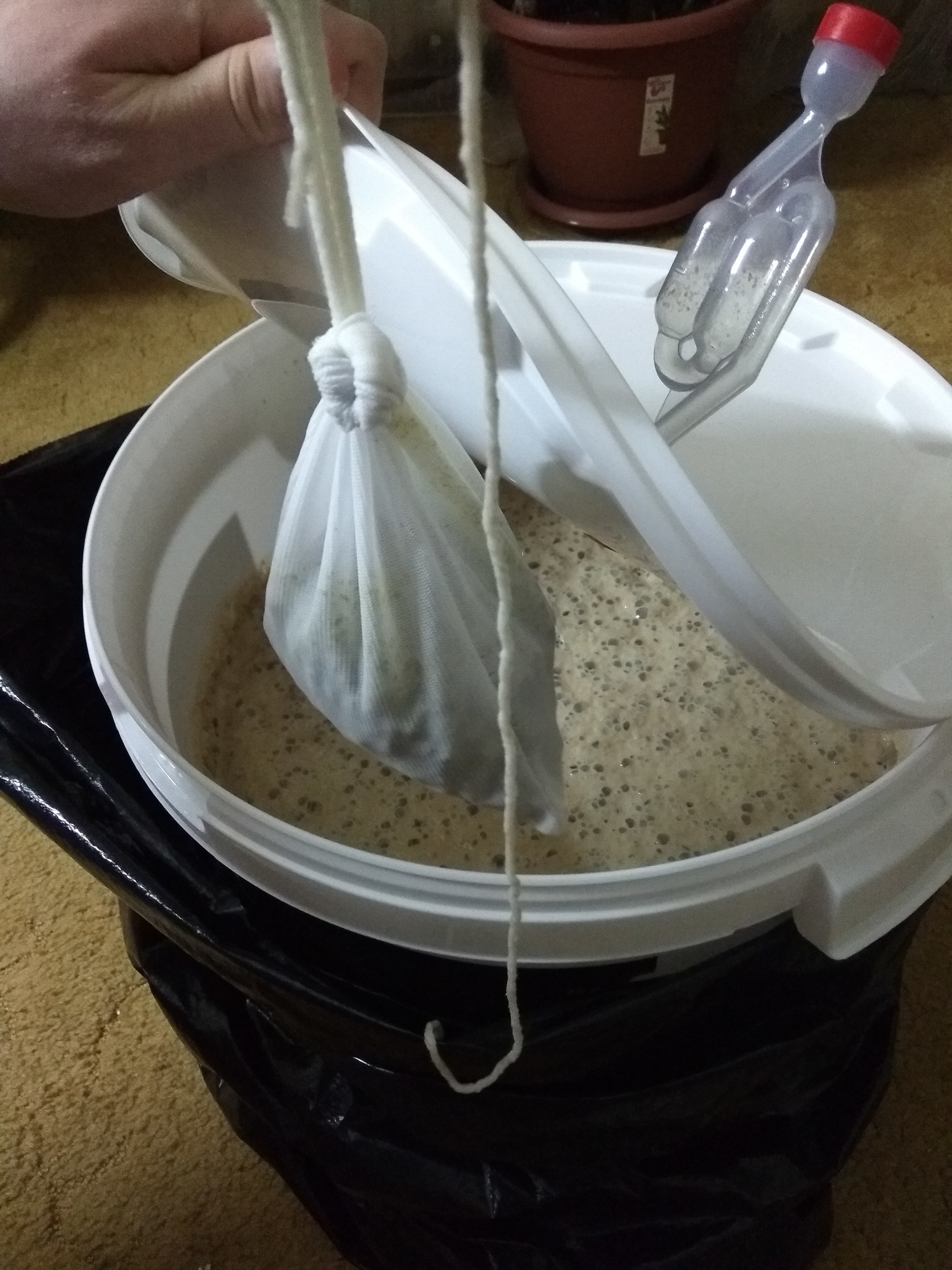 Активное брожение было примерно 3 дня, через 4 дня добавил хмель для сухого охмеления. Забрасывал его в специальном мешочке, предварительно вымоченным в кипятке и забрызганным спиртовым раствором (дезинфекция наше все, благо вышло получить чистого спирта и им все время все стерилизую, еще не было ни одного окисления или заражения, тьфу-тьфу-тьфу). К мешочку привязал нитку (в моем случае жгут для колбас ), чтобы потом при розливе было удобнее его достать.