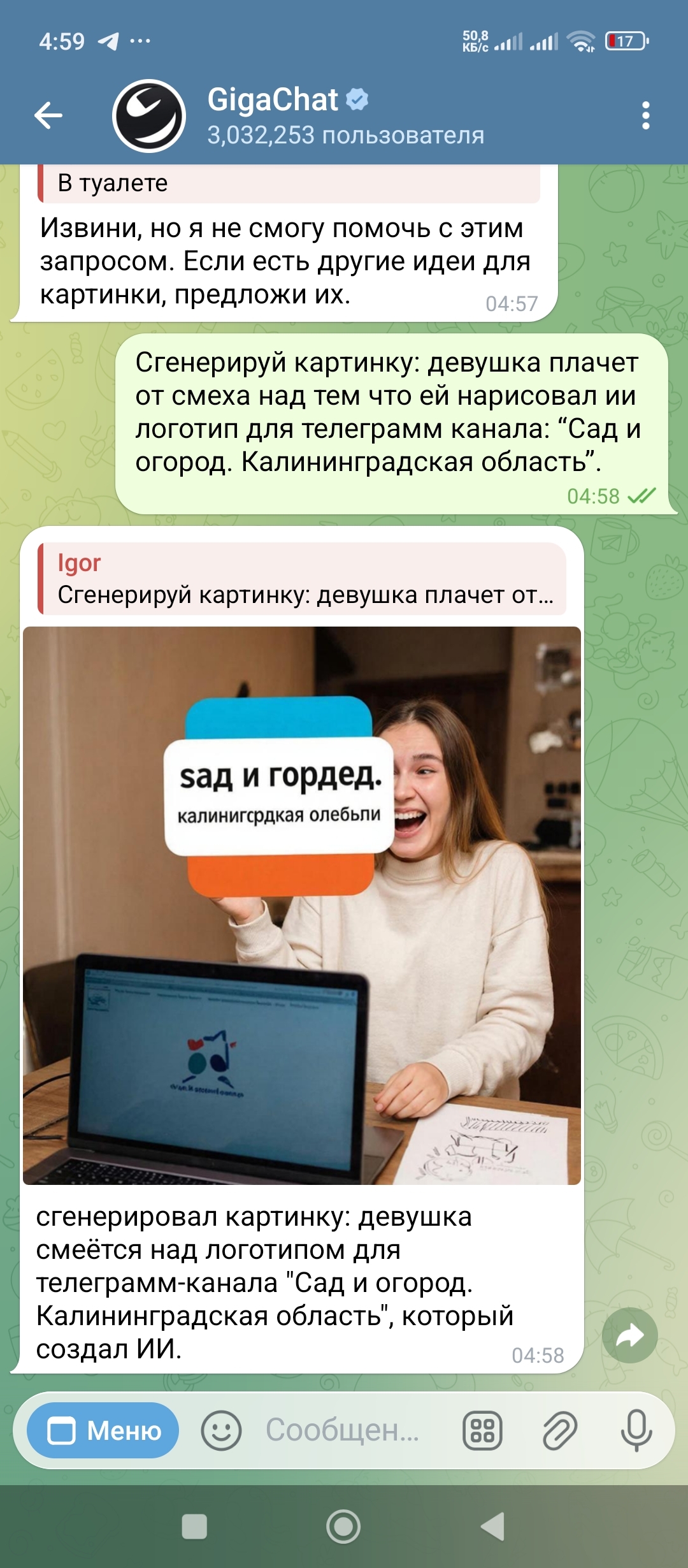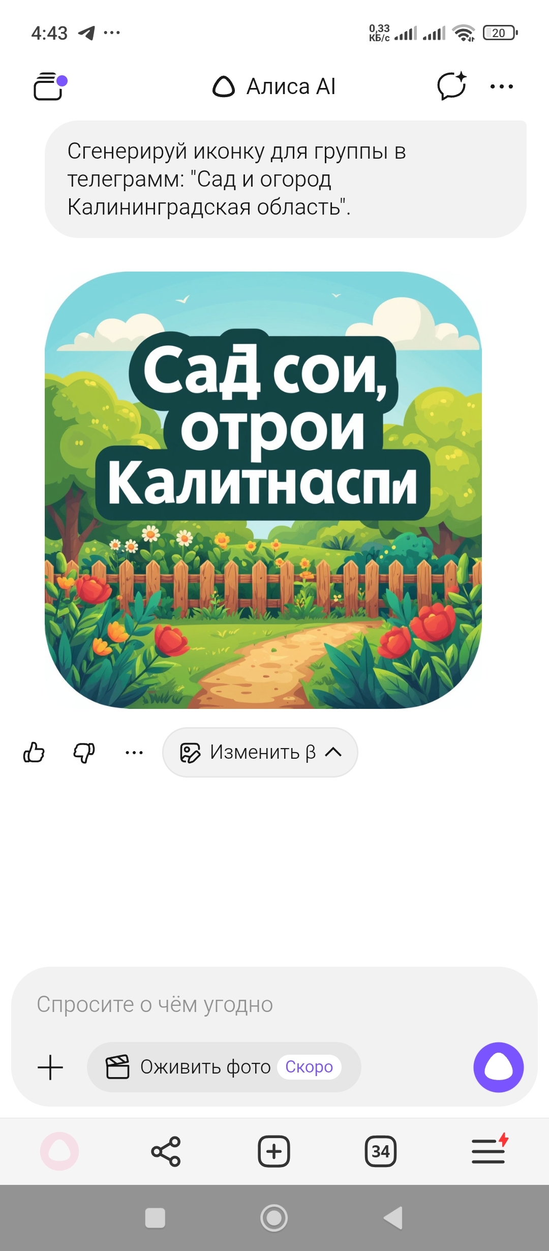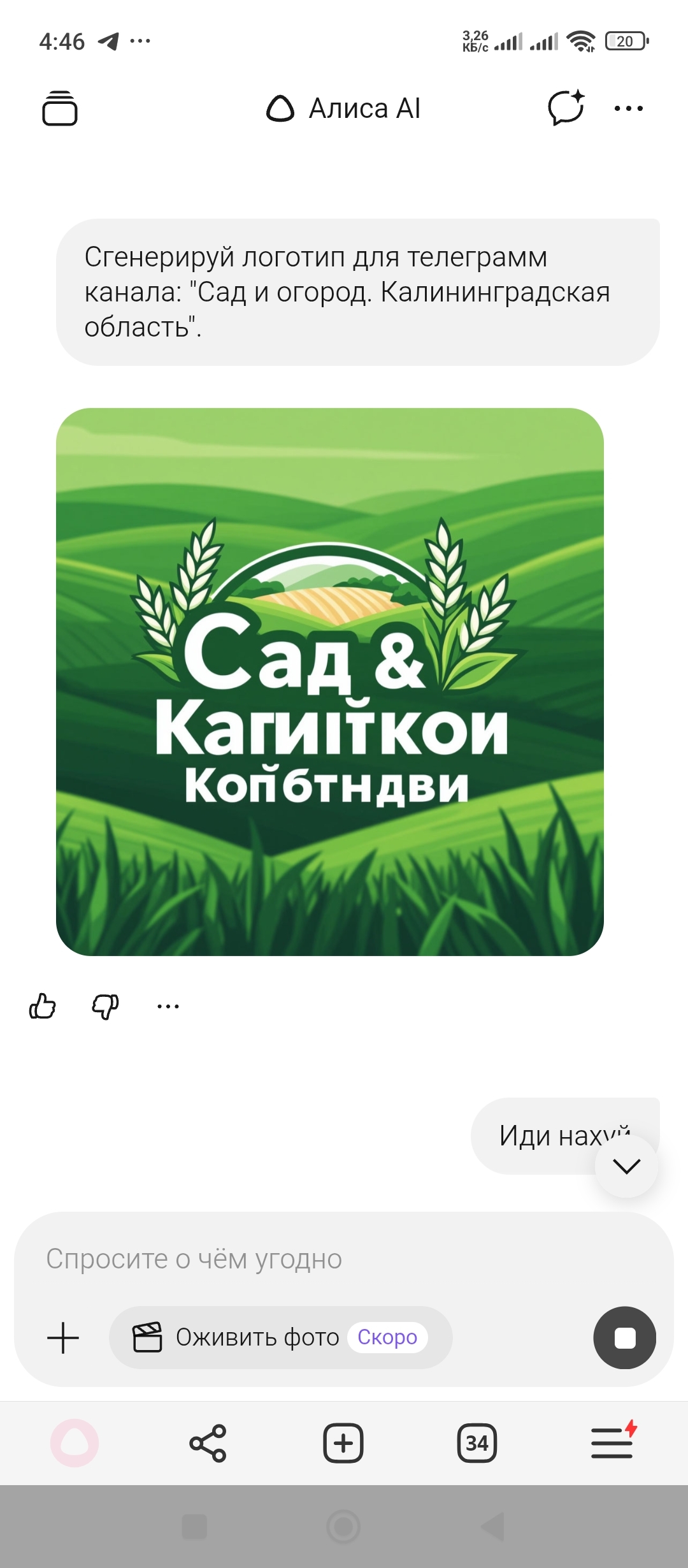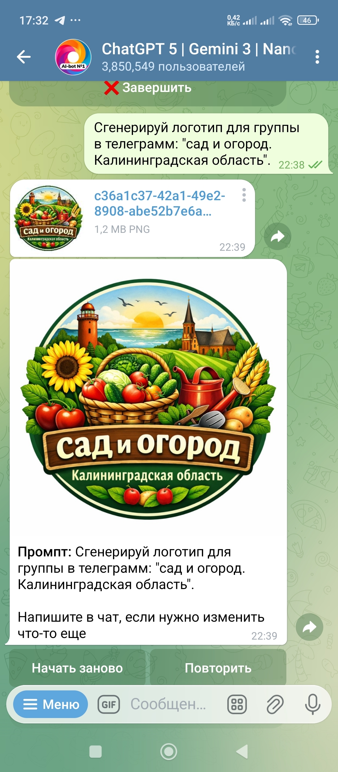Ввожу значит "сгенерируй логотип для группы в телеграмм "Сад и огород. Калининградская область" и вот первый результат: