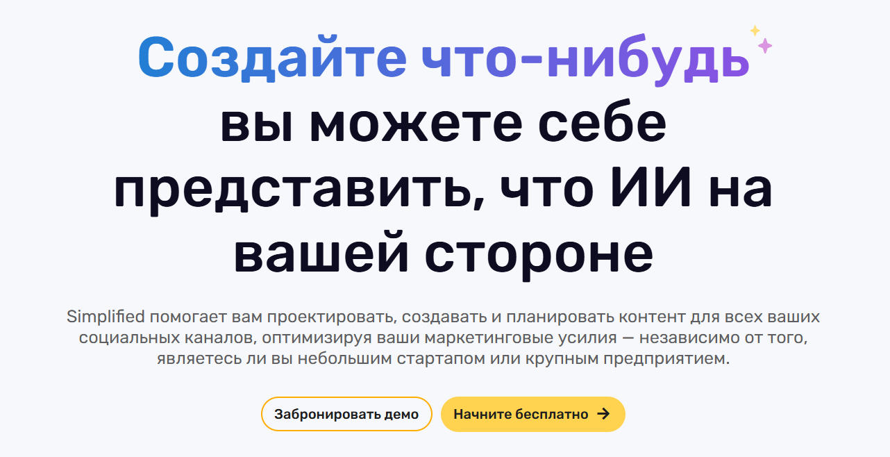 Simplified — многофункциональная платформа для контент-маркетинга с мощным генератором презентаций. ИИ создаёт слайды, подбирает изображения из встроенной библиотеки, генерирует тексты под разные аудитории.