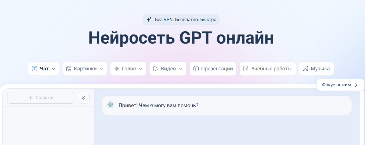 Нейросеть на русском языке для решения любых задач на работе и учебе. Платформа также предлагает инструменты для создания изображений, озвучивания текста и генерации видео, анализ и работы с файлами. Просто загрузите файл в окно чат-бота, отправьте запрос и ждите результат. Информацию из файлов ИИ может суммировать в таблицу, схему или диаграмму.