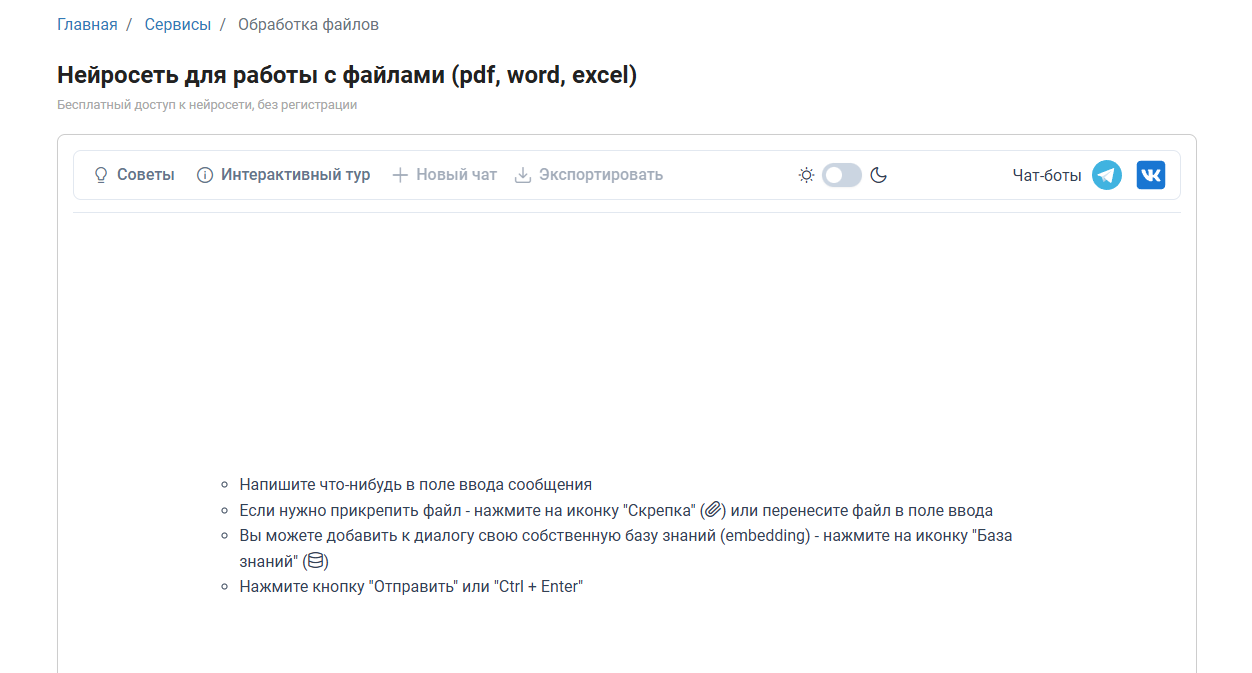 Виды поддерживаемых файлов: PDF, DOCX, XLSX, TXT, PPTX, изображения (JPEG, PNG, GIF, WEBP).