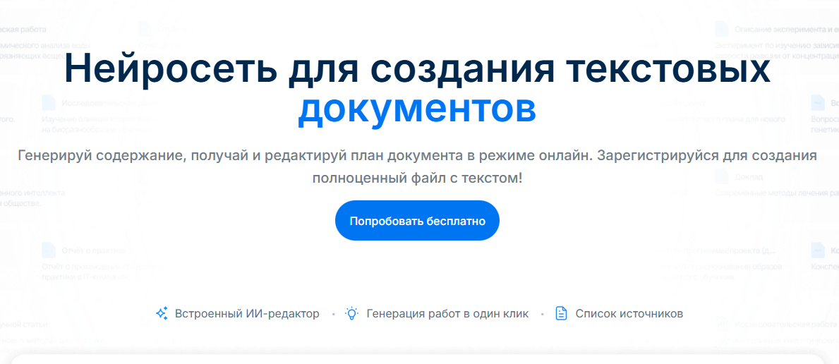 ИИ для обработки файлов, который предлагает инструменты на базе модели ChatGPT для создания и редактирования текстовых материалов, таких как студенческие работы, эссе, доклады и большие документы. В разделе генератора документов можно задать тему, получить план и доработать текст во встроенном редакторе, а затем скачать итоговый файл в формате DOCX. Работа с файлами строится по шагам: задайте структуру файла, затем уточните содержание, отредактируйте документ и сохраните финальный вариант.
