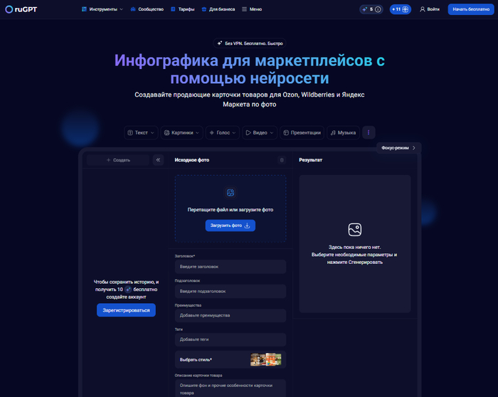 Сегодня эту задачу всё чаще решают с помощью нейросетей, которые позволяют автоматизировать создание карточек и значительно ускорить процесс. Например, в сервисе ruGPT.io можно загрузить фото товара, указать основные параметры и получить готовую инфографику с заголовками, преимуществами и визуальным оформлением — без навыков дизайна и сложных программ. Это позволяет быстро тестировать разные варианты карточек и находить наиболее эффективные решения для продвижения товара.