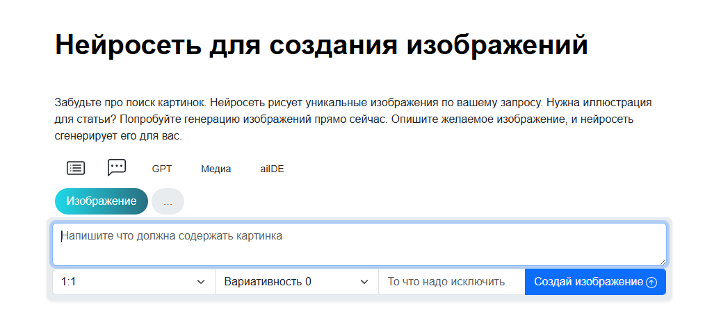 Дополнительные функции: ИИ-коллаж онлайн, генерация по тексту, выбор формата/соотношения сторон, вариативность изображений, работа на русском языке