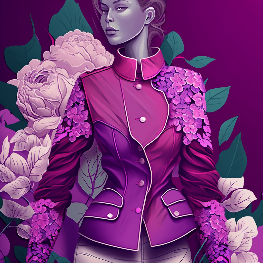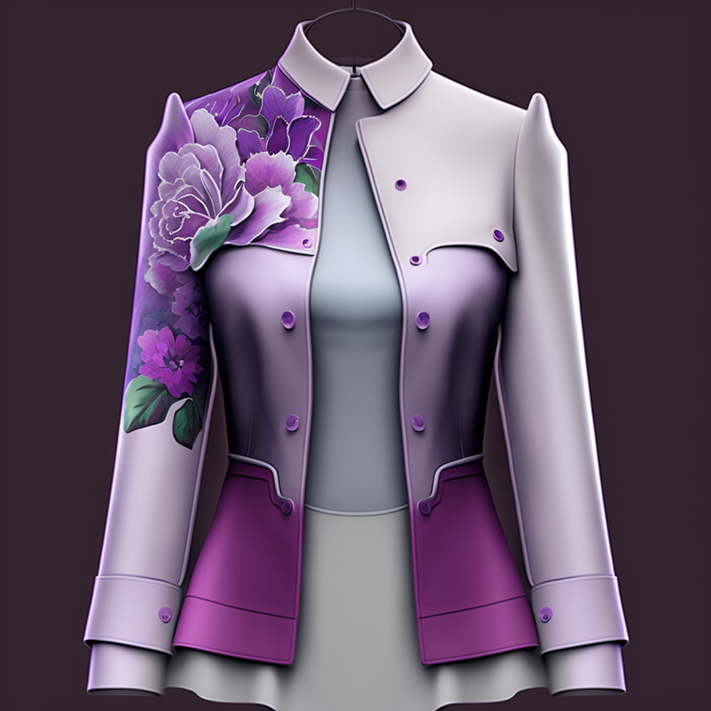 Промпт: lilac women's jacket with white lapels on the sleeves and hem:: colorful beautiful background with flowers