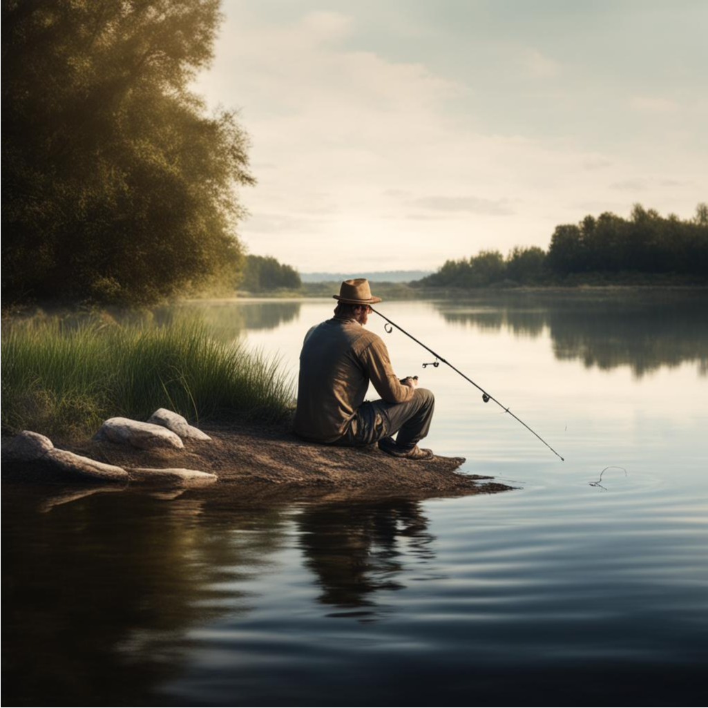 Запрос: мужчина с удочкой на берегу реки. Реалистичное фото