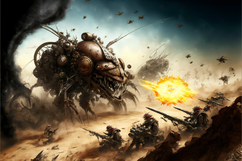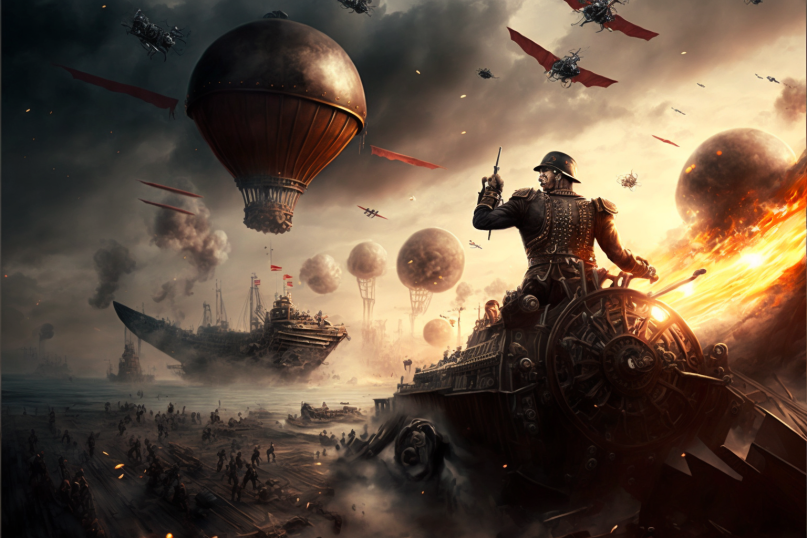 Все мы уже в курсе, что нейросеть знает буквально все: словно око Саурона Midjourney видит интернет насквозь. И вот мне стало интересно, как же она отреагирует на военную тематику. Конечно, реальных столкновений за историю человечества было уже предостаточно, поэтому я решил добавить ноток стимпанка. Вот что получилось: