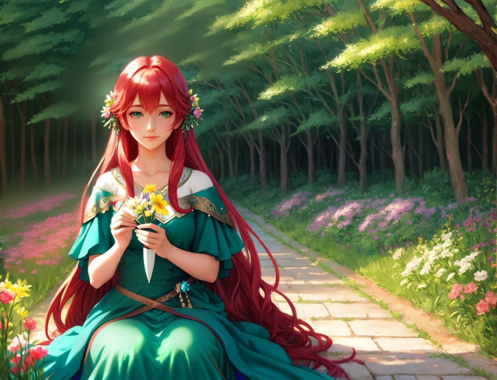 ✏️ Prompt: 1girl, red hair, freckles, emerald eyes, green dress, flowing fabric, windswept look, outdoor setting, mystical aura, ethereal beauty, enchanted forest, dappled sunlight, whimsical elements, (nature spirit:0.7), fanciful style, dreamlike quality, watercolor palette, (pastel colors:1.2), intricate details, soft focus, (wildflowers surrounding:0.8), (mystic breeze:0.9), (elven gracefulness:0.6), 3d depth, cinematic lighting, (sketchy lineart:1.1), (fantasy art:1.5), (high fantasy:0.7), solo character, serene expression, poised posture, elegant pose, slight smile, holding a flower, petals scattered around, magical atmosphere, otherworldly glow, (enchanted realm:1.3), (fairy tale charm:0.8).