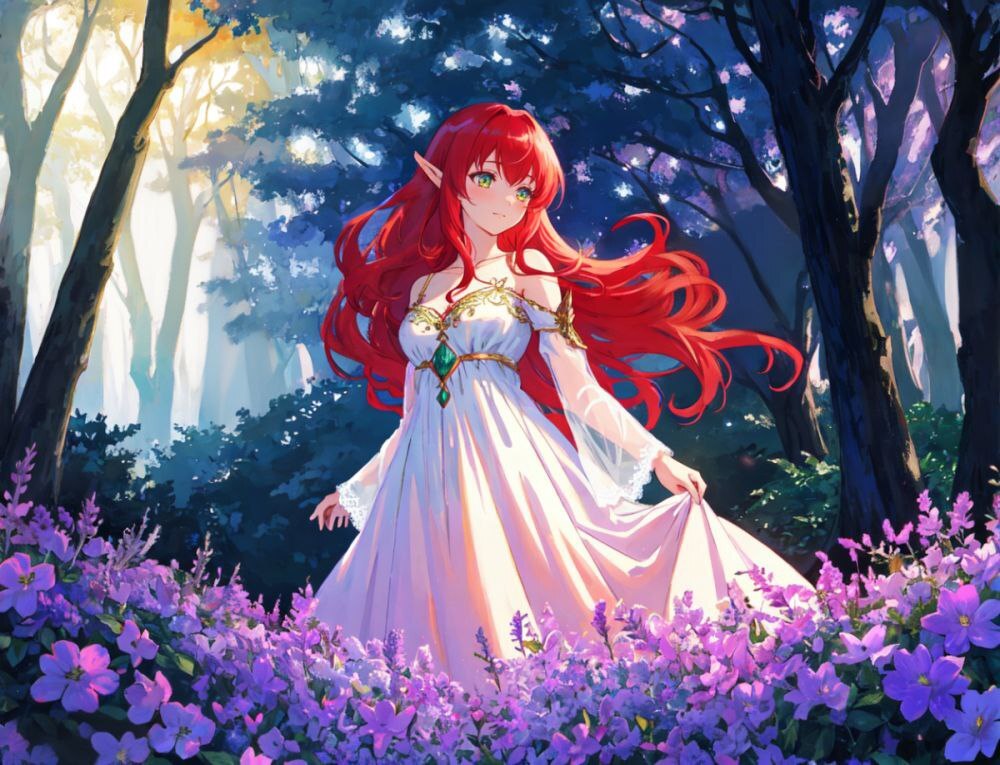 ✏️ Prompt: 1girl, fiery red hair, emerald eyes, mystical aura, ethereal beauty, enchanting smile, flowing gown, intricate lace detailing, delicate fabric that shimmers under soft moonlight, standing in a serene forest glade with ancient trees and luminescent flora, surrounded by a gentle breeze that plays with her hair, evoking a sense of tranquility and otherworldly charm. The background features a twilight sky with hues of lavender and gold, where stars begin to peek through the fading light. The image is imbued with a touch of whimsy and a hint of magic, capturing the essence of an elfin queen or a woodland nymph. (enchantress:0.8), (fantasy:1.2), (mystical realm:1.0), (whimsical effect:0.7), vibrant colors, high definition, digital art