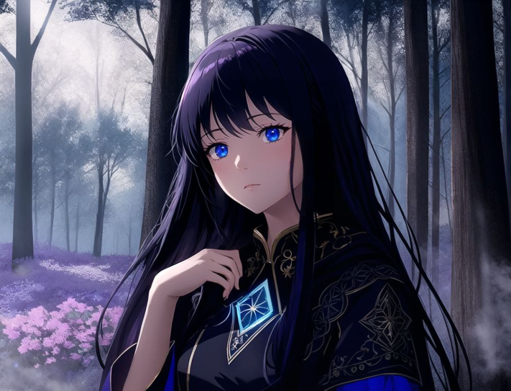✏️ Prompt: 1girl, long black hair, piercing blue eyes, mysterious aura, cloak with a hood, intricate embroidery, standing in a mystical forest at dusk, soft glowing light emanating from her hands, ethereal background, mist and fog swirling around, (detailed:1.5), (mystical:0.8), (glow:0.7), fantasy art style, rich color palette with accents of deep blues and purples, high contrast between the subject and the surroundings, (enchanting:0.9), (serene:0.6), [busy:0.5], (sketchy elements:0.4), (warm lighting effect:1.2), creating an atmosphere of ancient magic and untold stories, with a hint of melancholy in her expression as she seems to be contemplating the secrets of the universe or perhaps her own destiny.