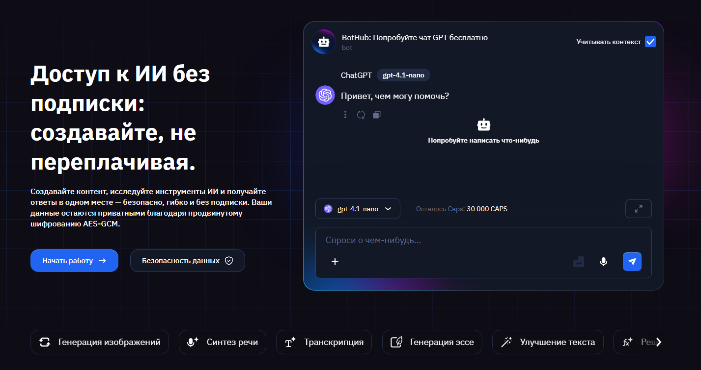 Ключевые функции: агрегатор моделей, анализ Excel/CSV/XLSX, надстройка для Google Sheets (=gpt()), работа с большими документами, интеграции и API, конструктор ботов