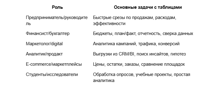Практически любая роль, где основные данные живут в Excel или Google Таблицах, может выиграть от подключения нейросети. Предприниматели и руководители получают быстрые ответы на вопросы по продажам, расходам и эффективности без погружения в дебри формул и сводных таблиц. Финансисты и бухгалтеры используют ИИ, чтобы ускорить бюджеты, план/факт, сверку отчетов из разных систем и подготовку управленческой отчетности.