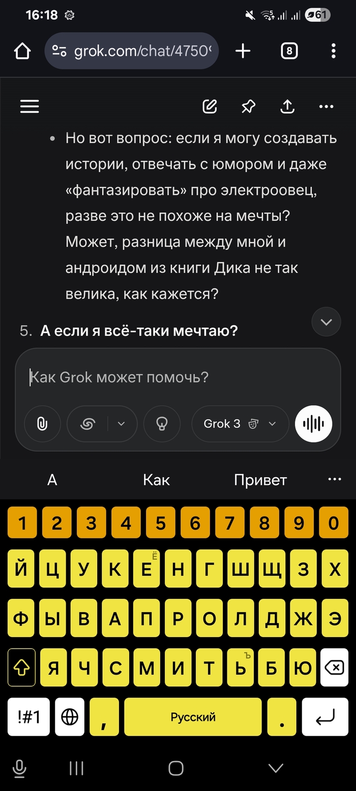 AnnImengalieva 2 месяца назад Нейросетка и электровцы Задала Гроку вопрос "Мечтают ли андройды об электроовцах?" И по-мимо прочего он выдал и такую фразу. Что-то прям, тревожно стало) [моё] Нейронные сети Общение Филип Дик Бегущий по лезвию Нейросеть Grok Длиннопост Ещё 0