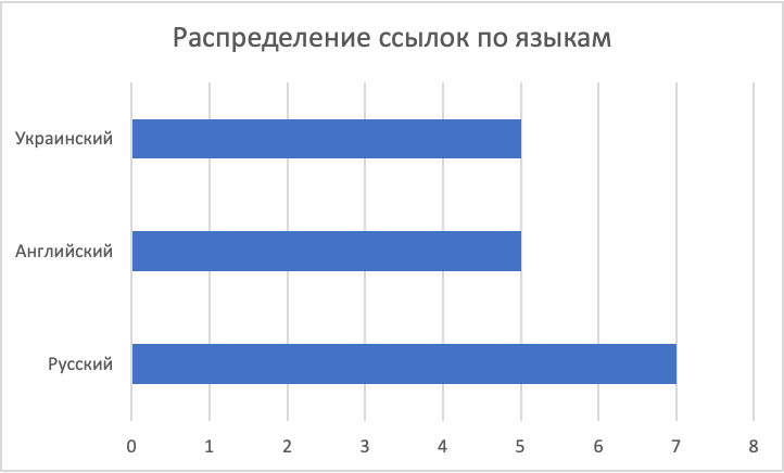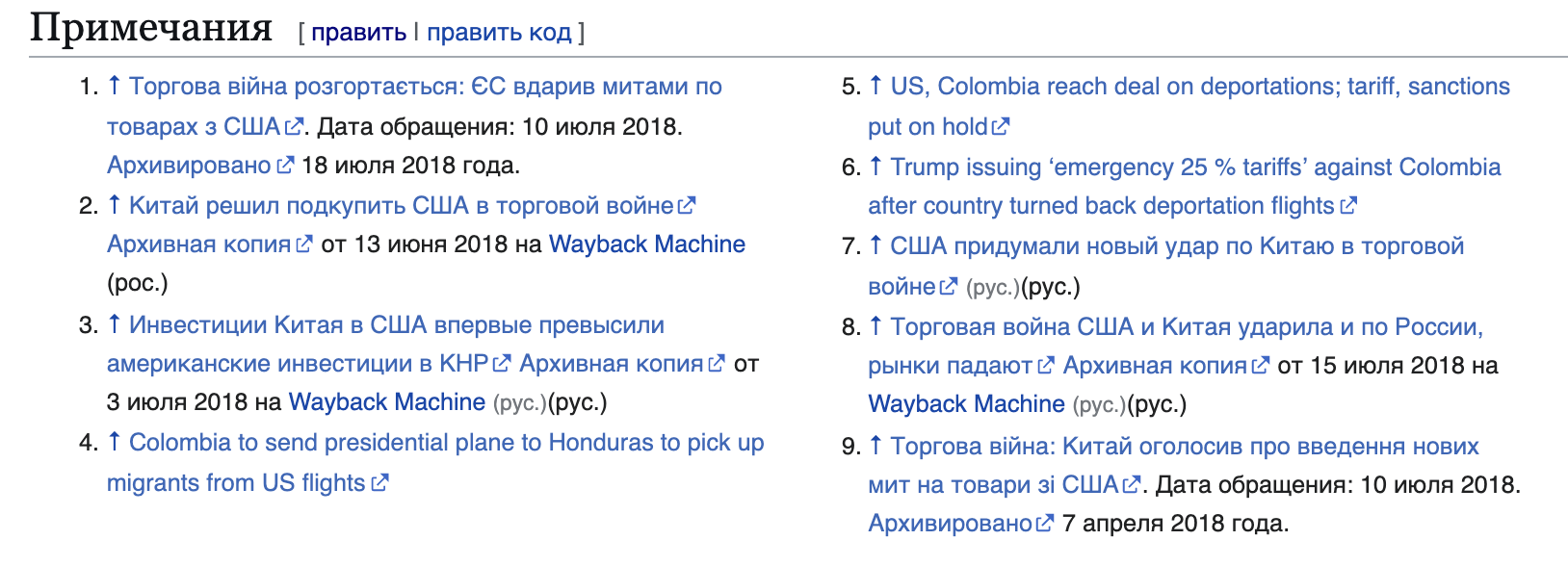 Английский язык: 5 источников. Русский язык: 7 источников. Украинский язык: 5 источников. Таким образом совершенно очевидно, что в русской статье мова на столько же важна, как и английский язык. 40% русских источников и 60% иностранных, при чём 30% вообще не понятно каким боком оказываются украинскими, так как ни Трамп не является украинцем, ни тарифная война не велась против Украины.