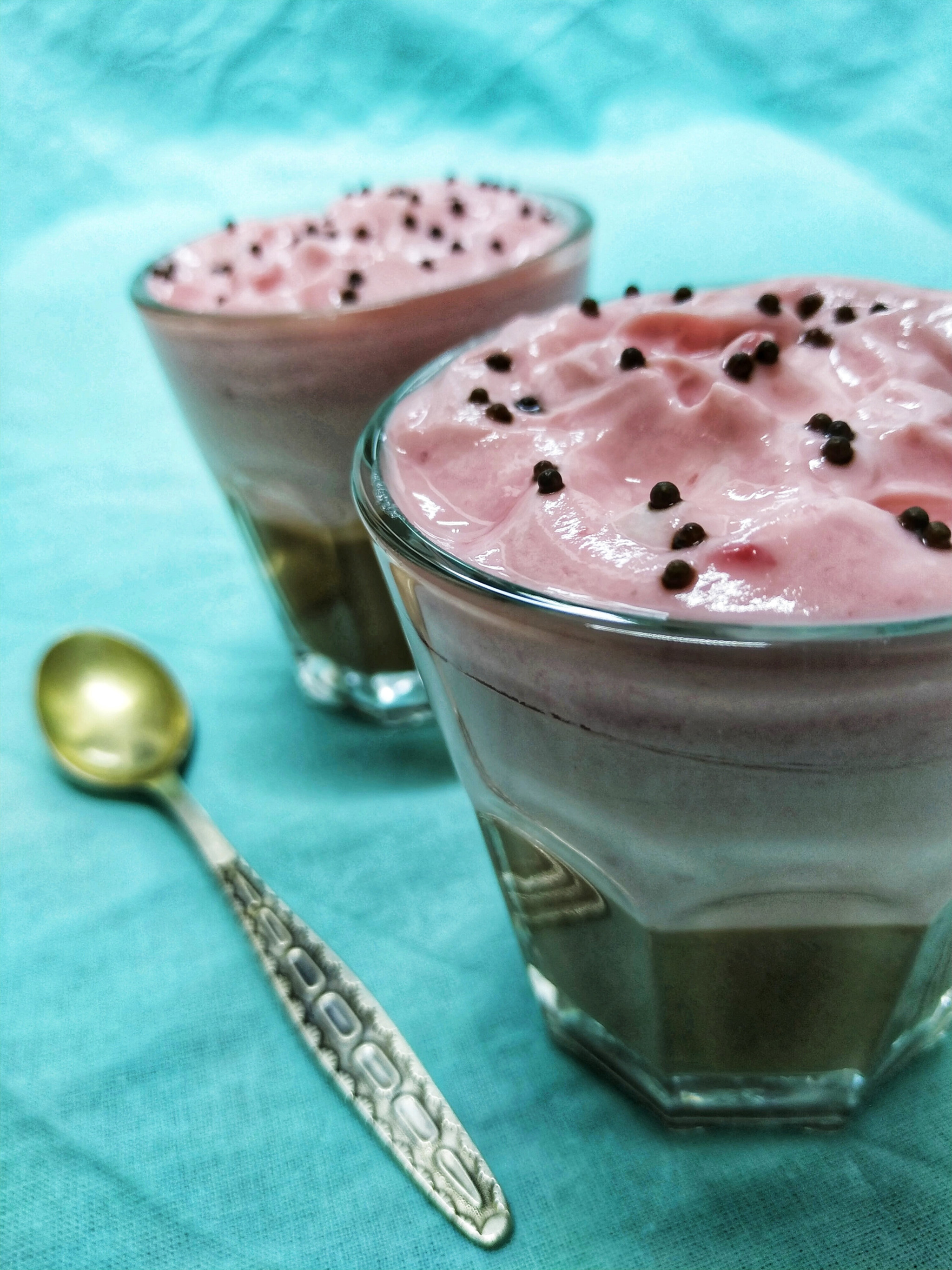 половину добавить в смесь с какао. хорошо вымешать. разложить по стаканам. отправить в холодильник минут на 15, чтобы она загустела