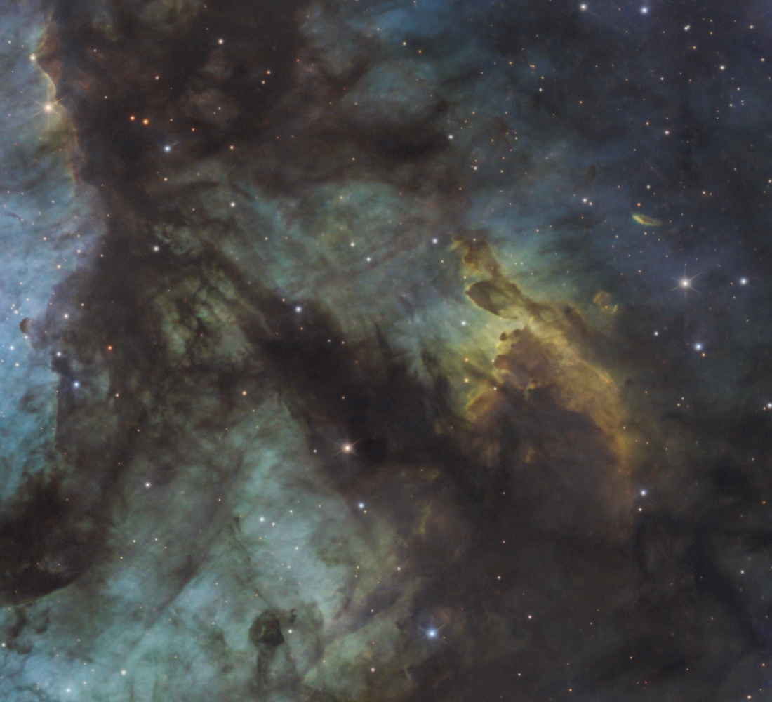 NGC 7822 — это настоящий космический хаос из пыли и газа. Ни на что не похожее зрелище, особенно в таком масштабе. Поэтому у него и нет яркого собственного названия, только каталоговые номера. Хотя, если снять его вместе с соседней туманностью на меньшем фокусном расстоянии, они вместе издалека напоминают знак вопроса. За этим комплексом даже закрепилось народное название «Знак вопроса». Но вот конкретно эта часть собственного имени, похоже, не имеет.