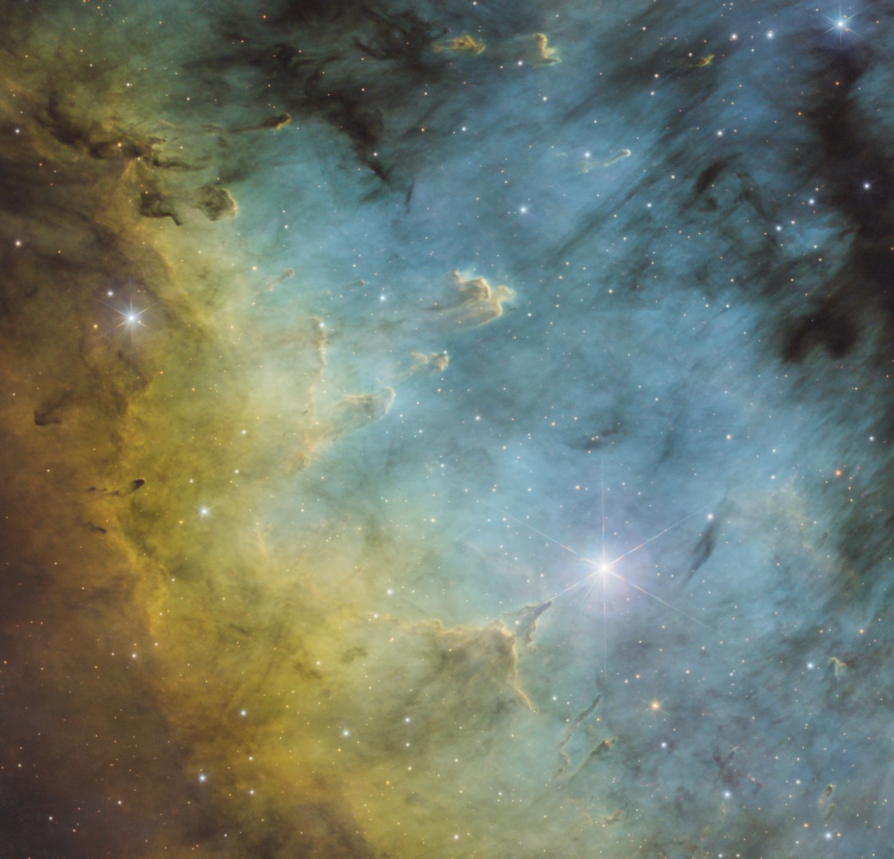 Палитра SHO (классика: водород — зелёный, кислород — синий, сера — красный).