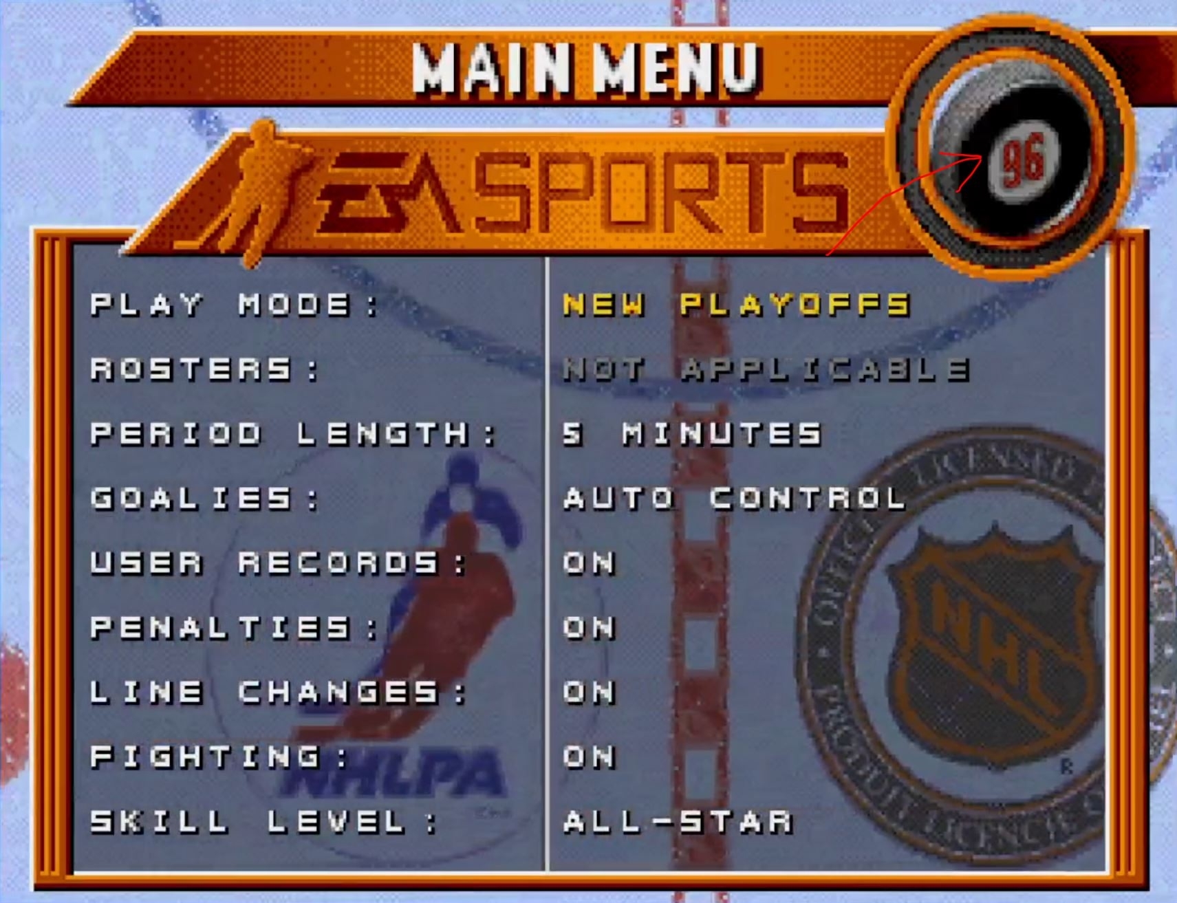 Для меня было важно зацепить 96-й, именно он был в детстве! В нём, обратите внимание на начальной заставке-меню и между матчами, есть анимация вращающейся шайбы!