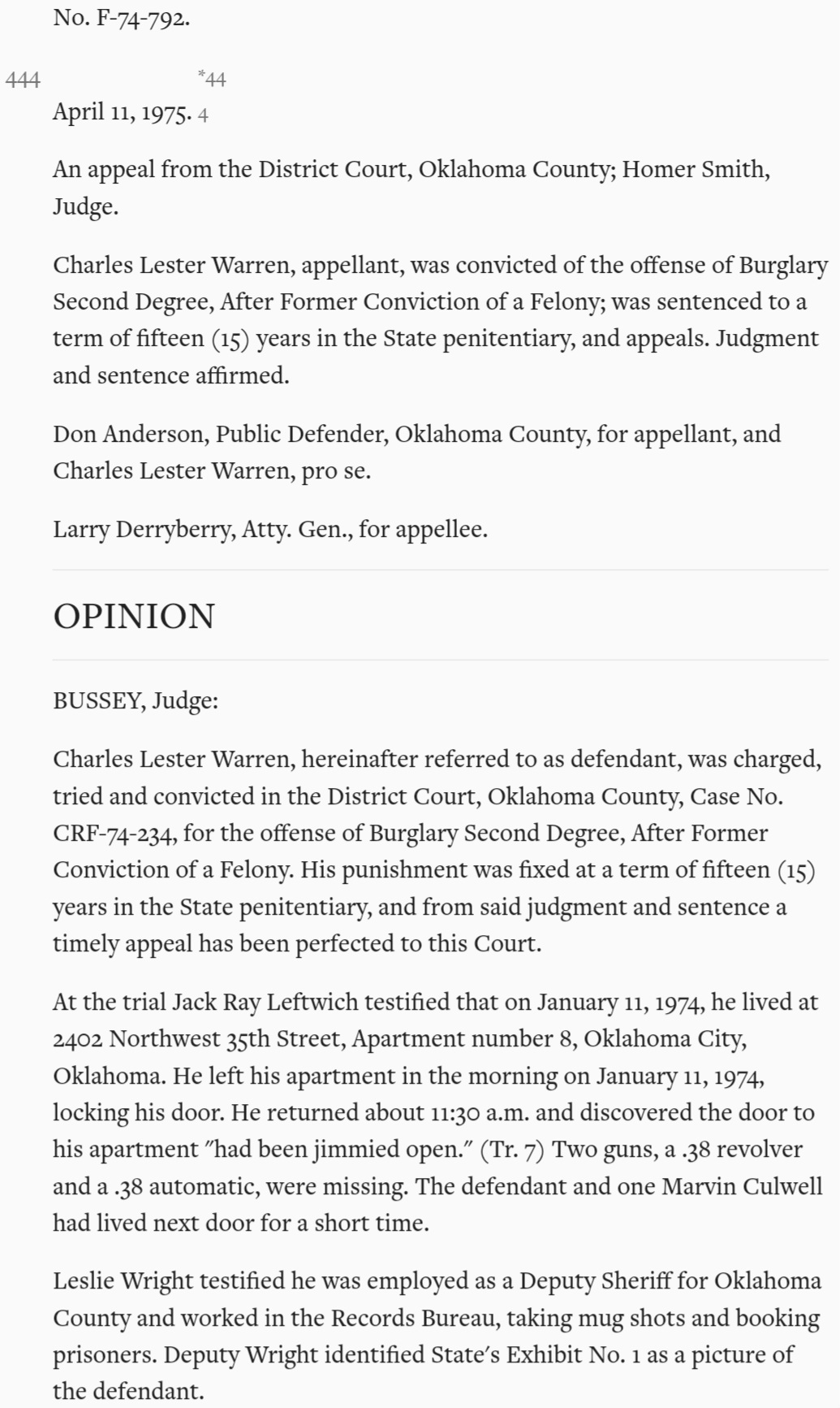 Апелляционный документ штата Оклахома на Уоррена за 1975 год, в котором ему отказано в новом судебном разбирательстве по делу о краже со взломом второй степени, которое он совершил в январе 1974, украв из квартиры своего соседа два пистолета и сумку. За эту кражу он получил в июне того же 1974 года 15 лет тюремного заключения, хотя уже к 1982 вышел на свободу по УДО (при этом, в документе упоминается что ранее, до 1974, он уже был судим за какое-то преступление, но подробности этого не называются):