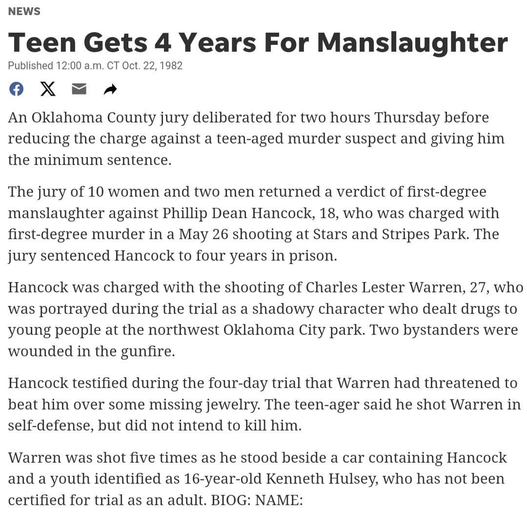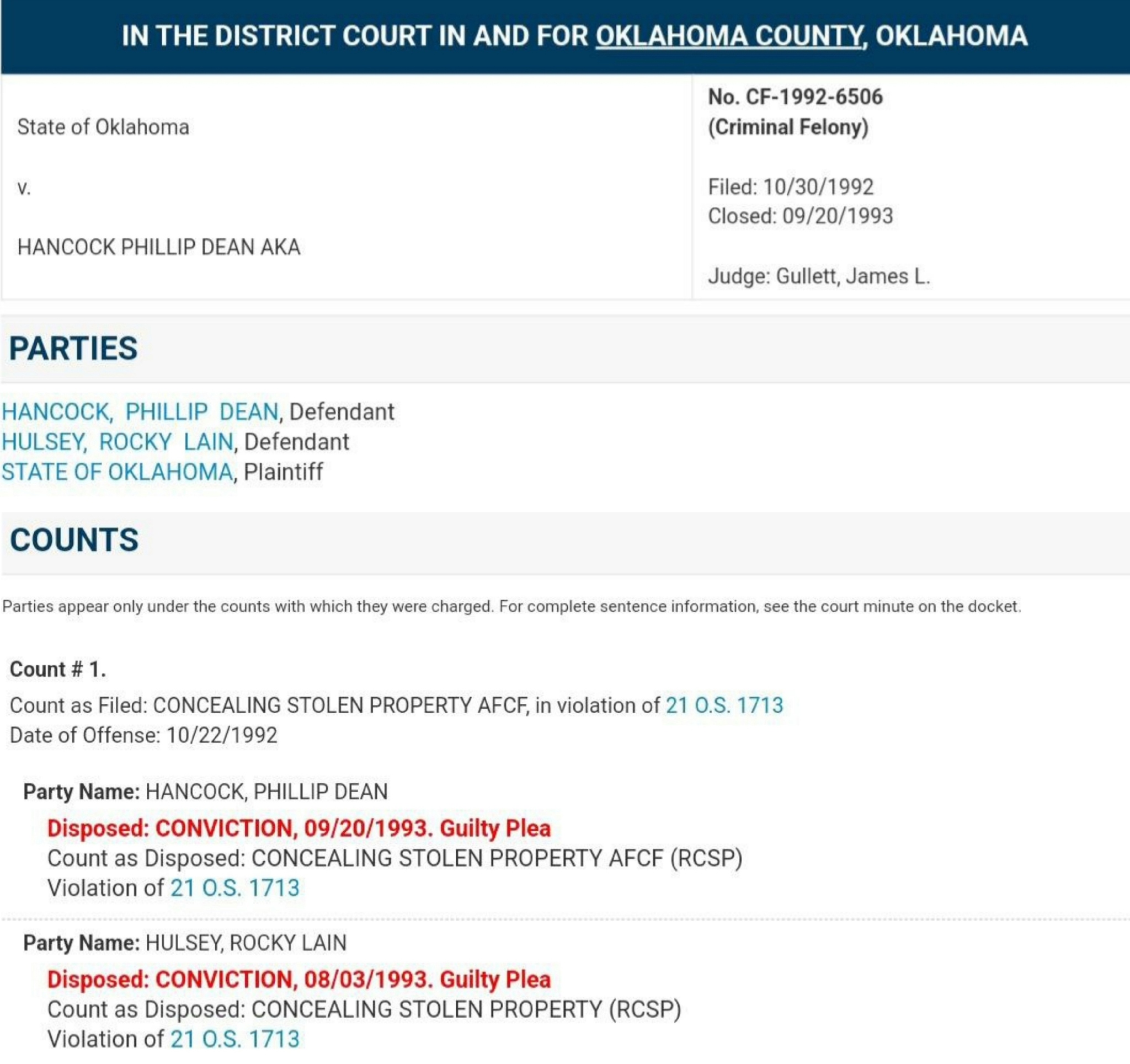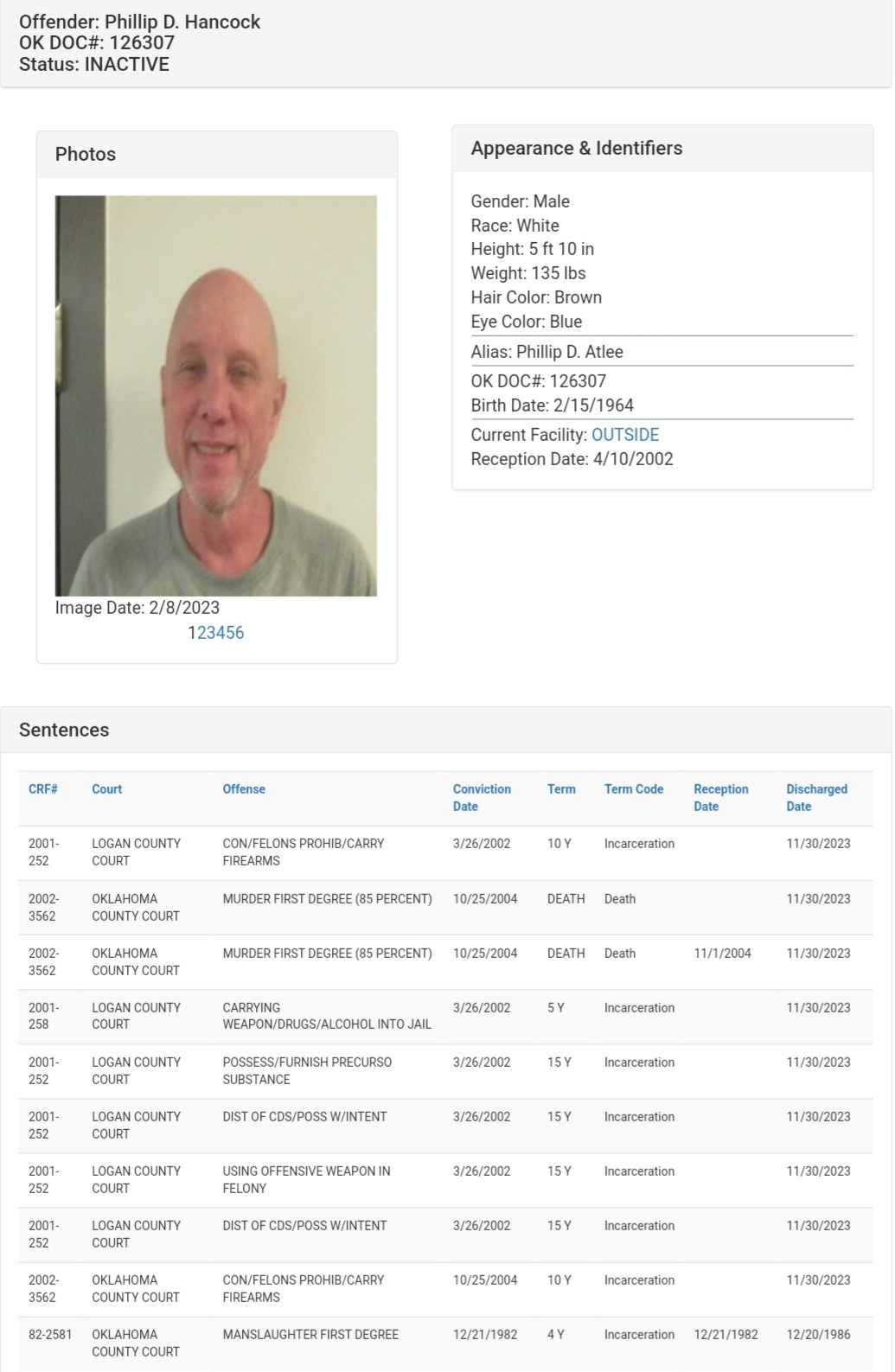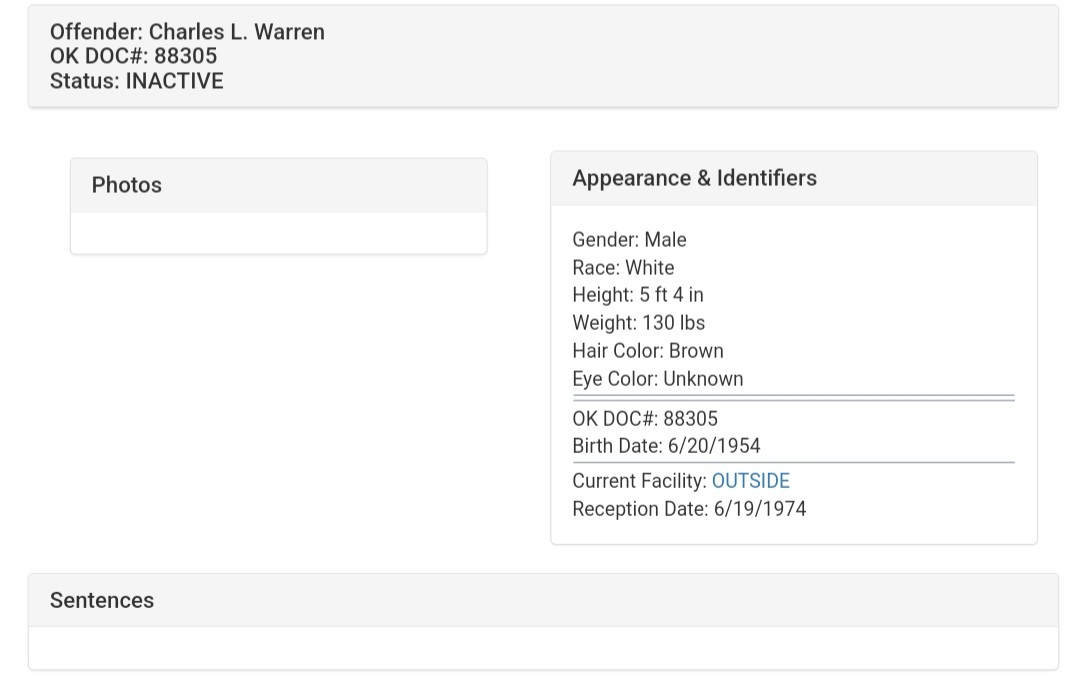 Онлайн-досье штата Оклахома на Уоррена, но его приговоры почему-то не были заполнены - есть только имя, дата рождения, физическое описание и дата ввода в тюрьму (июнь 1974):