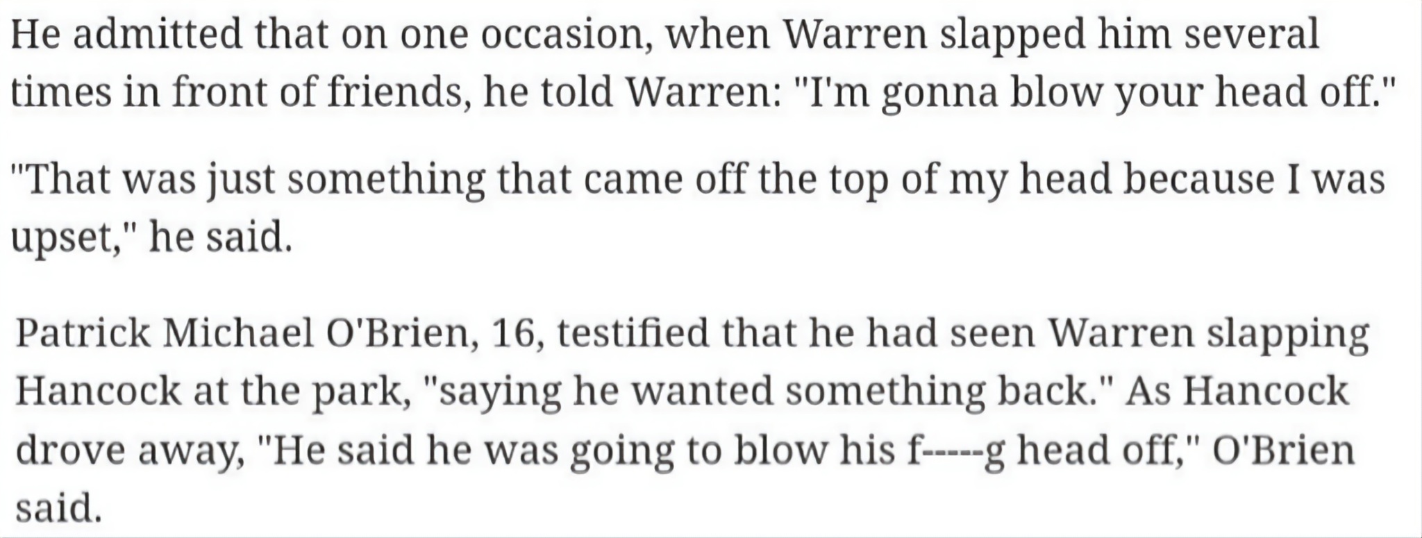Впрочем, Хэнкок при уходе несколько раз выкрикнул Уоррену что "оторвёт ему голову" - хотя тот никак на это не отреагировал - и затем по возвращению домой действительно решился убить Уоррена, желая ему отомстить за избиение: